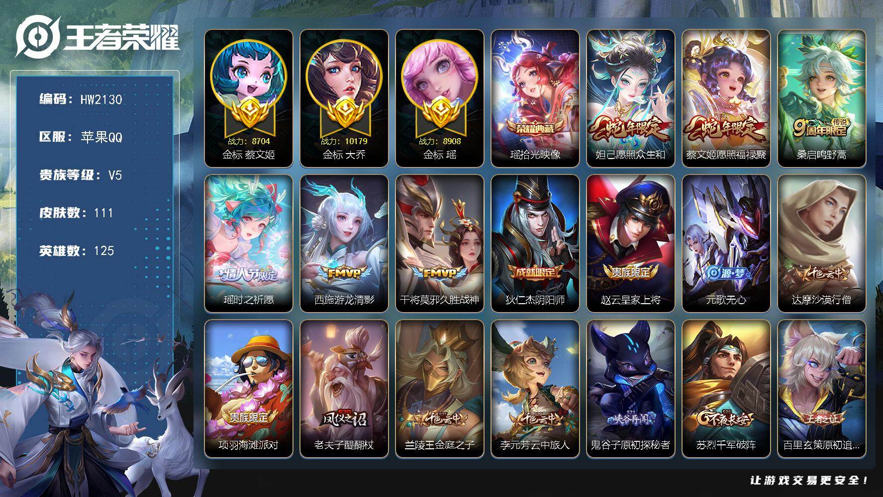 iOS*妹子号*金标万战大乔*金标瑶*金标蔡文姬*111皮肤1典藏6传说【荣