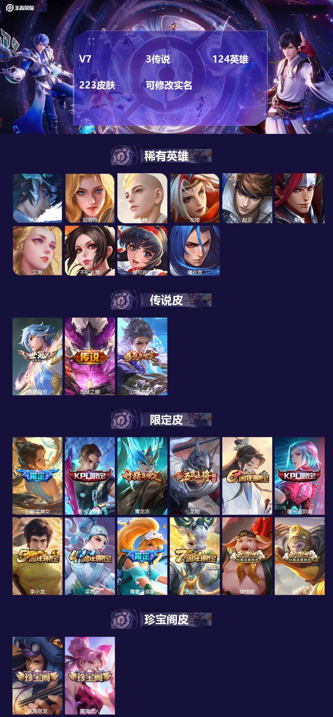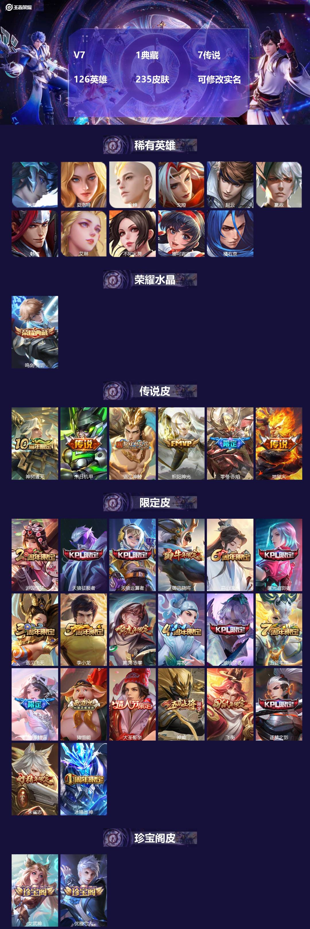 V7 1典藏 7传说 126英雄 235皮肤 可修改实名 【英雄全皮】影全皮
