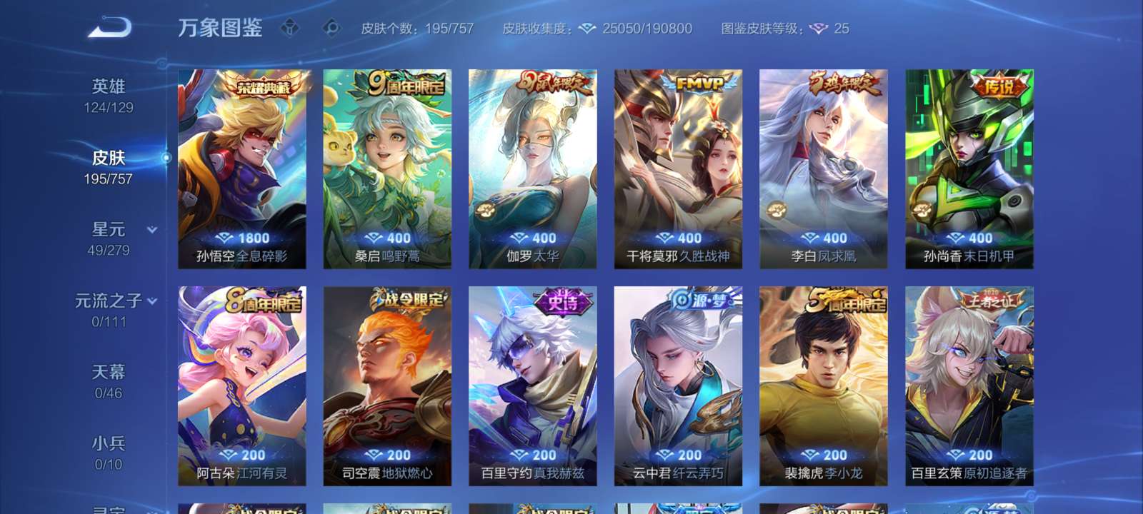 安卓v/最强王者/241皮肤/126英雄/1典藏/0珍品无双/1无双/3珍品传说/16传说/67史