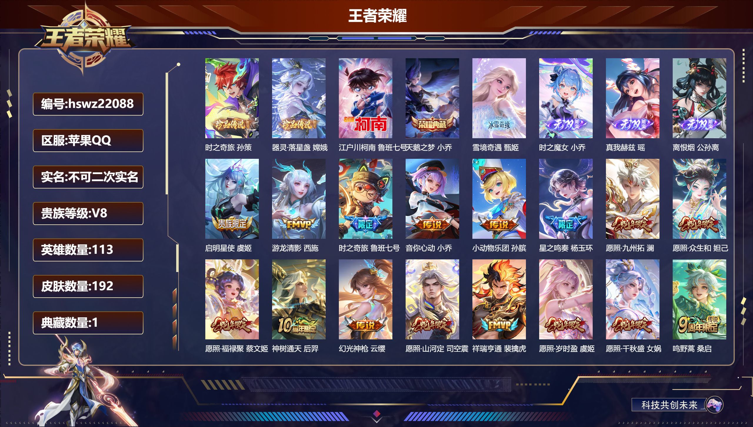 苹果QQ/至尊星耀/192皮肤/113英雄/1典藏/0珍品无双/4无双/3珍品传说/19传说/67史