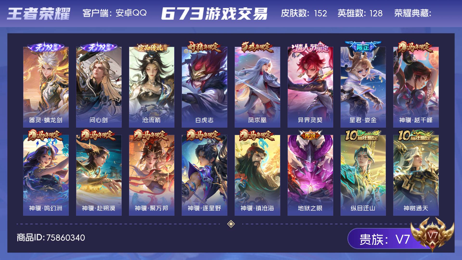 V7 皮肤152 英雄128 无双王者 无双皮肤2 珍品传说1 星传说1 传说18 其他皮肤137