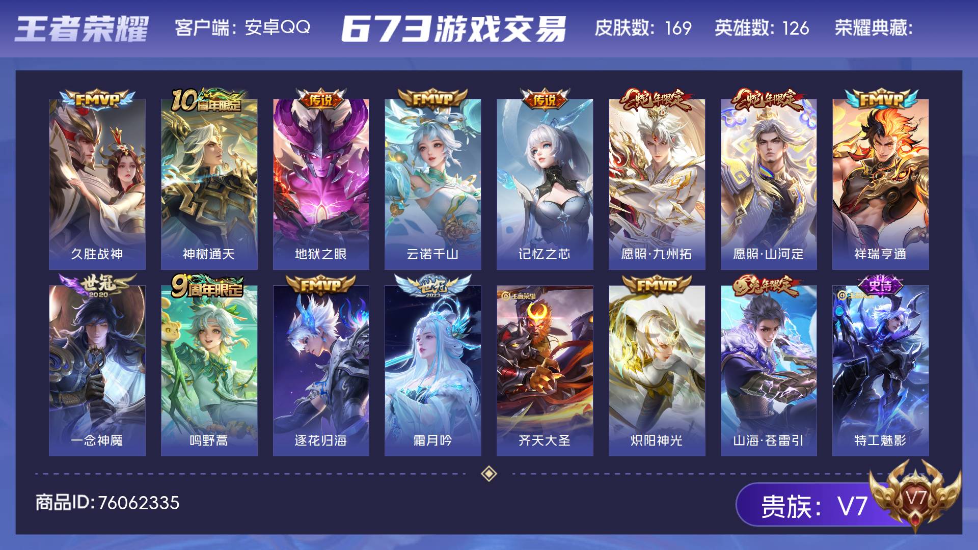 V7 皮肤169 英雄126 至尊星耀 星传说1 传说15 其他皮肤160