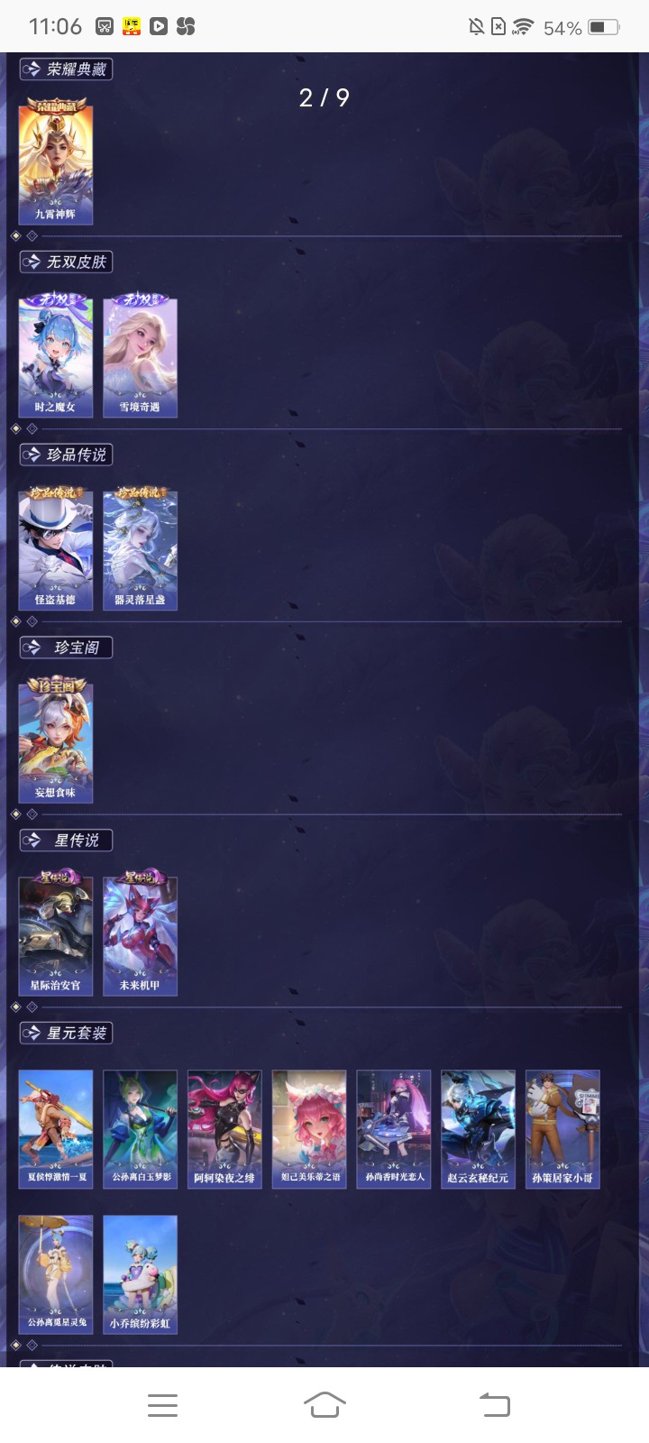 荣耀典藏1 无双2 珍品传说2 星元皮肤2 传说皮肤25 星元套装9