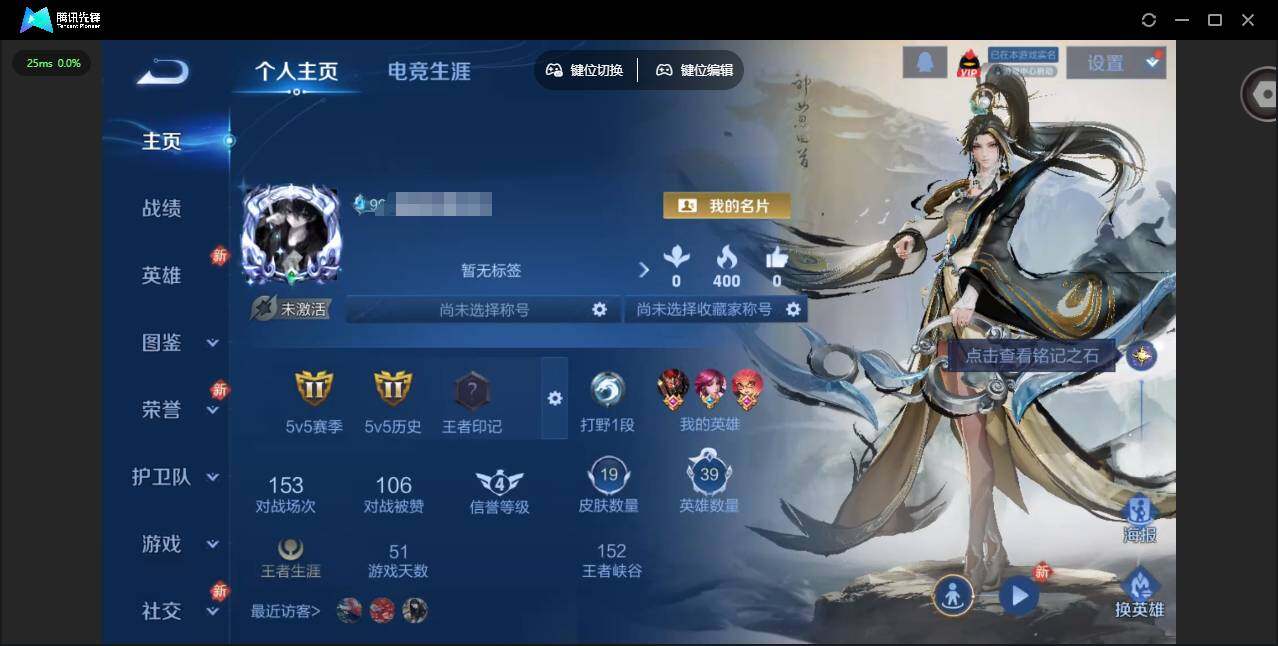 贵族等级: V4 英雄数: 39 皮肤数: 19 珍品传说: 沧流箭 传说皮: