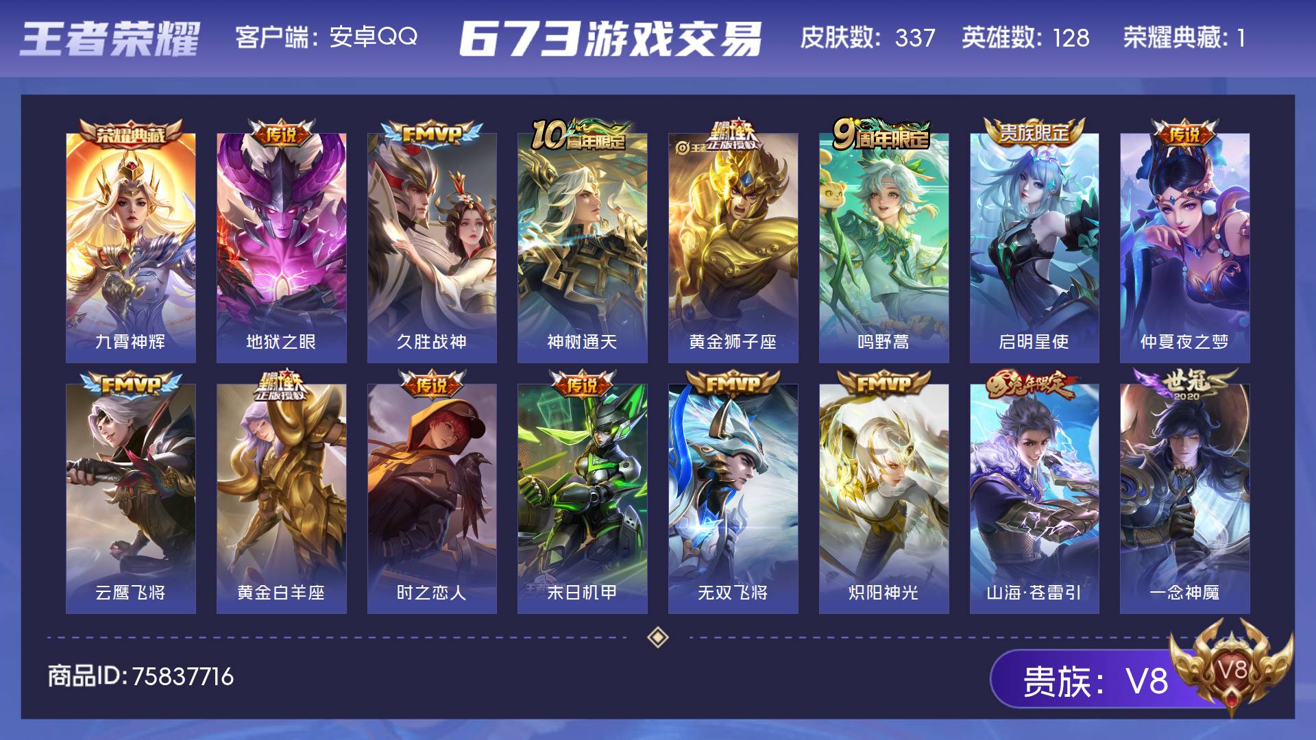 V8 皮肤337 英雄128 非凡王者 荣耀典藏1 传说22 其他皮肤321