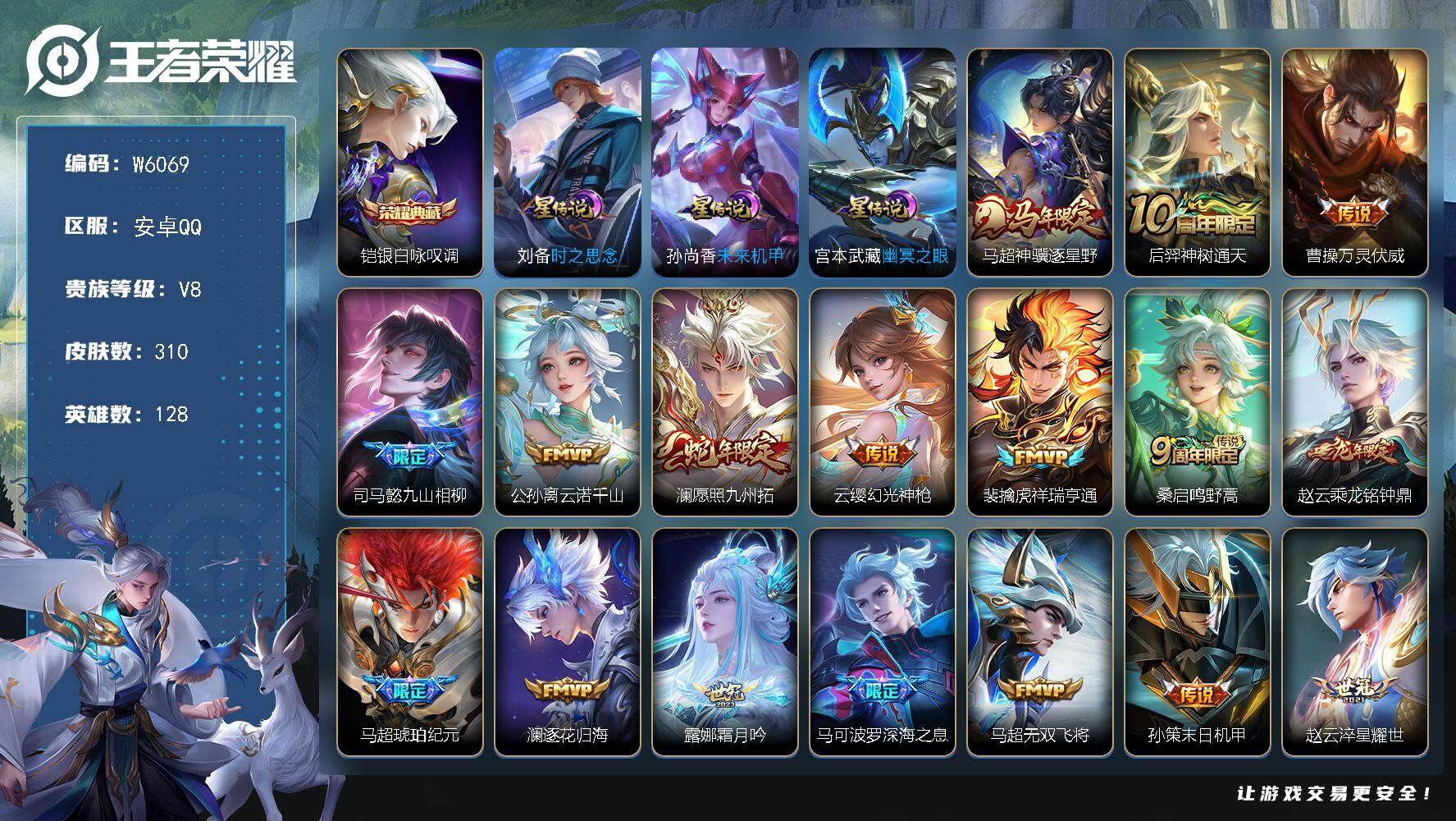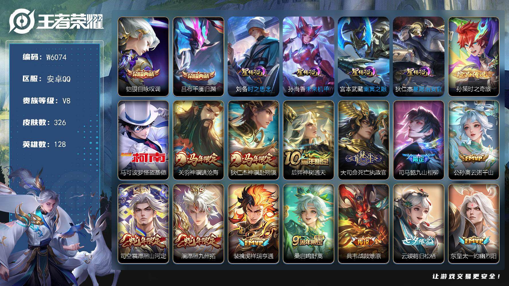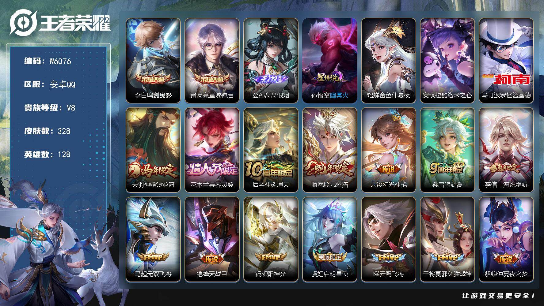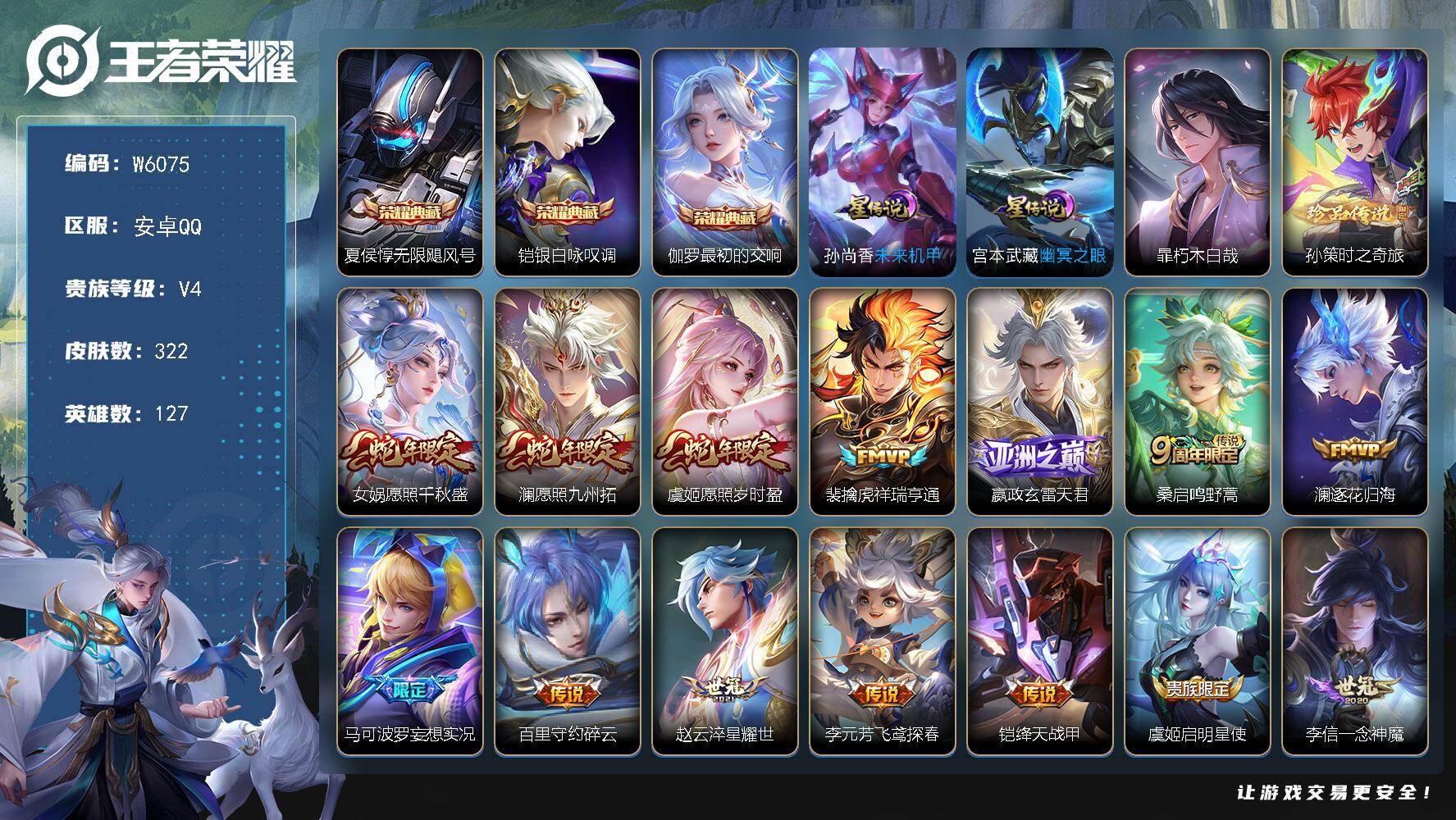 【W6075】安卓Q区-可二次-贵8-127英雄-322皮肤-3典藏-2珍品传