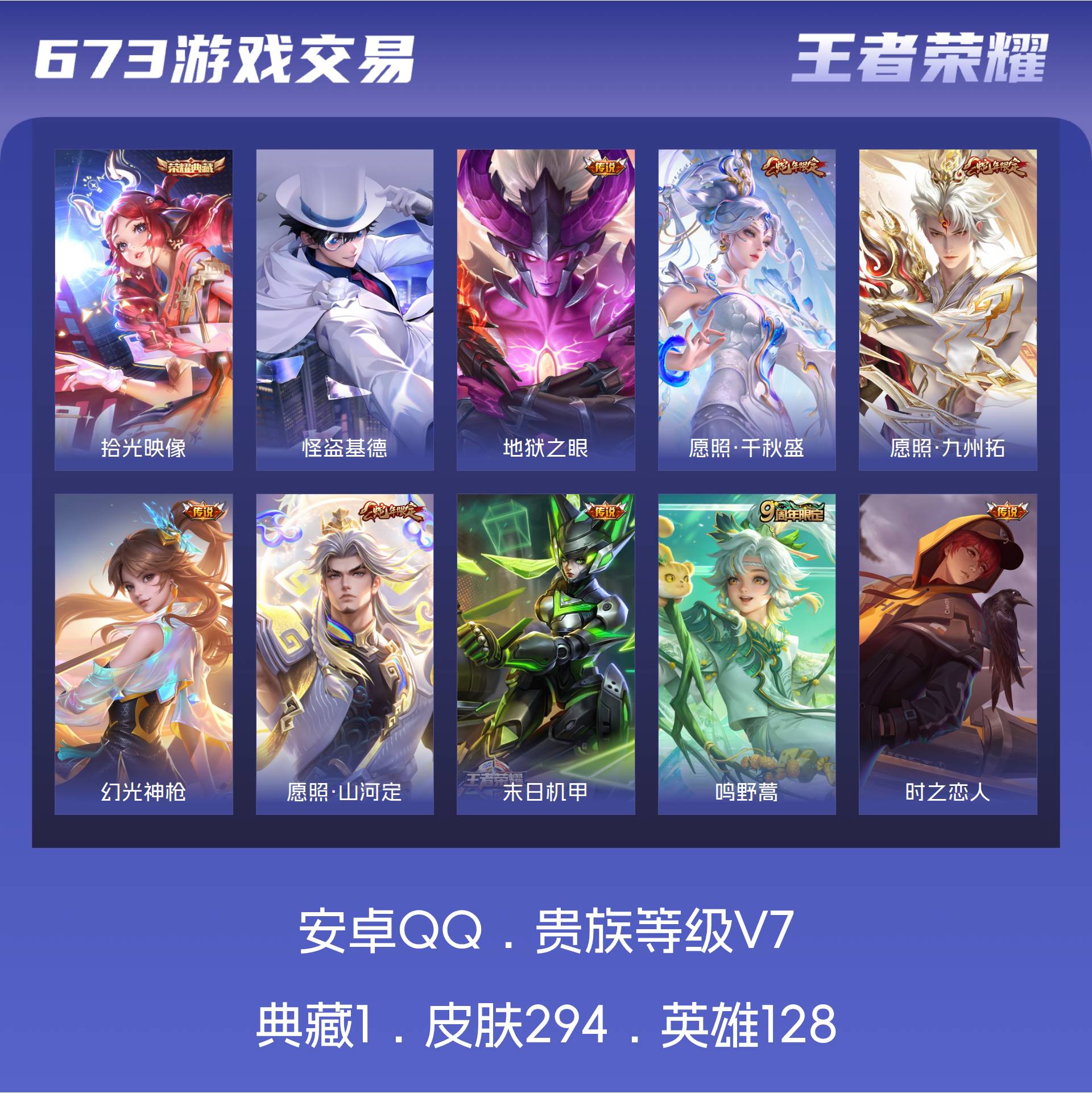 V7 皮肤294 英雄128 至尊星耀 荣耀典藏1 珍品传说1 传说10 其他皮肤288炽霜斩