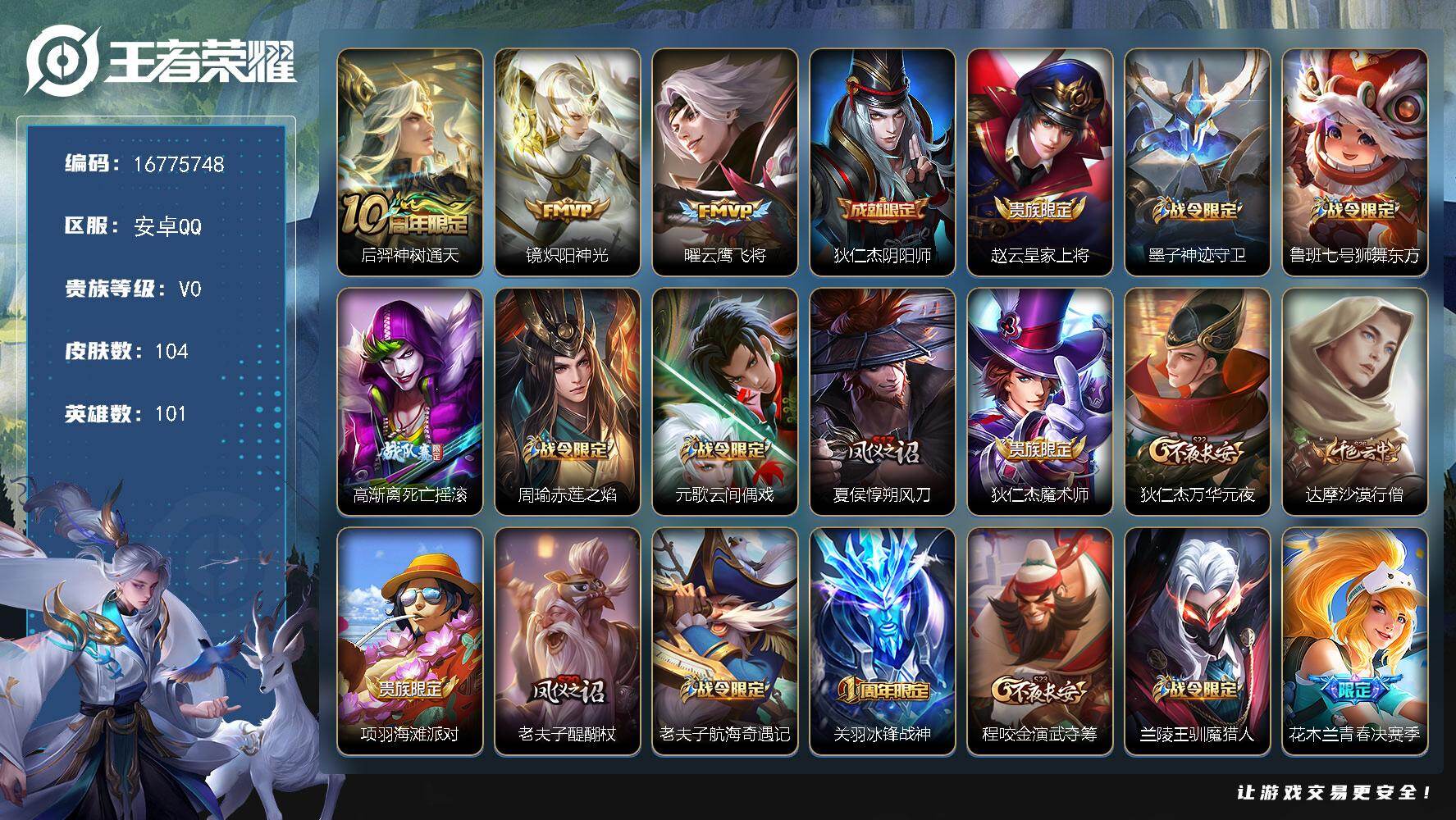 【16775748】安卓Q-V0-秩序白银III段位-101英雄-104皮肤-