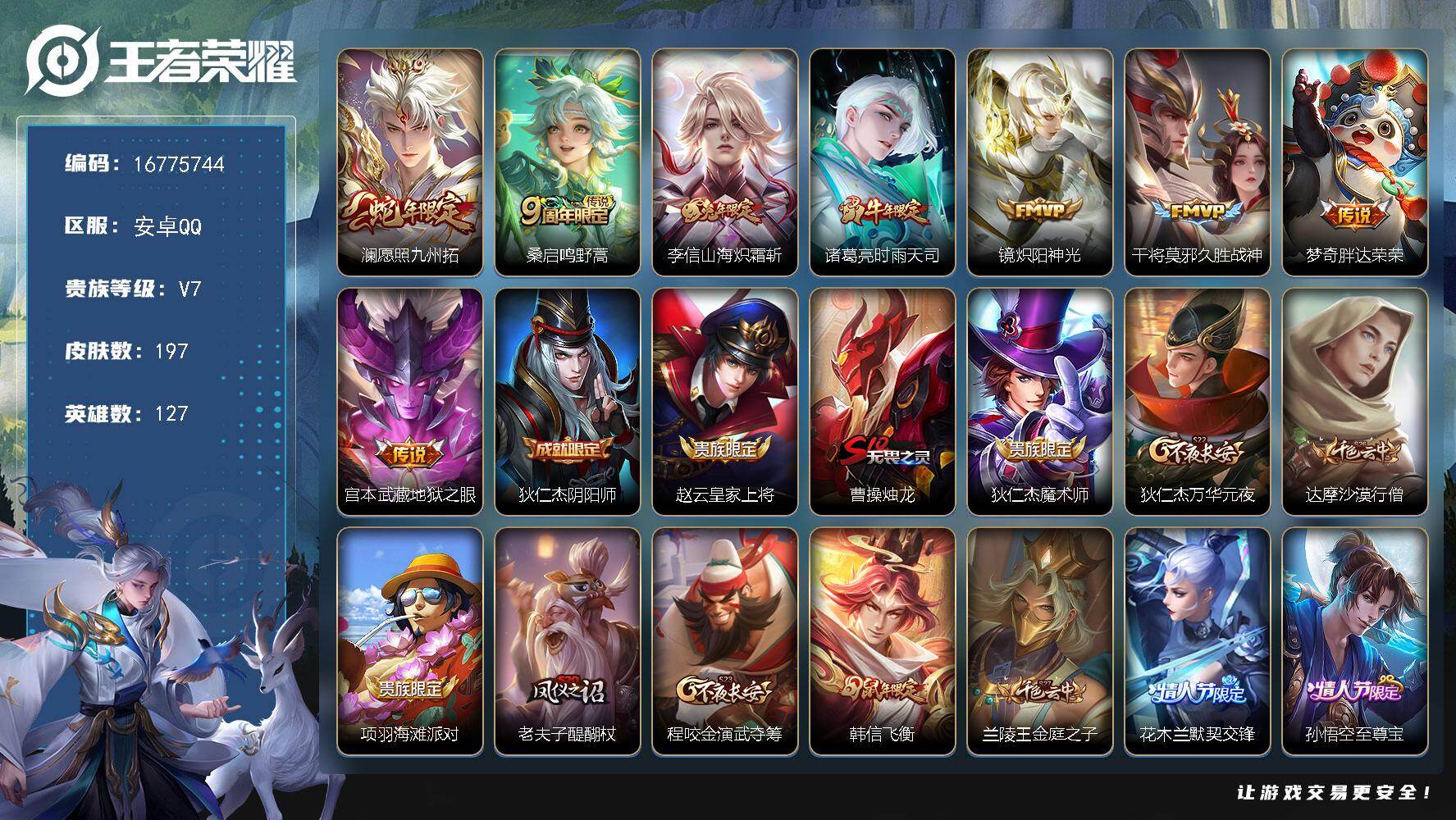 【16775744】安卓Q-V7-最强王者段位-127英雄-197皮肤-8传说