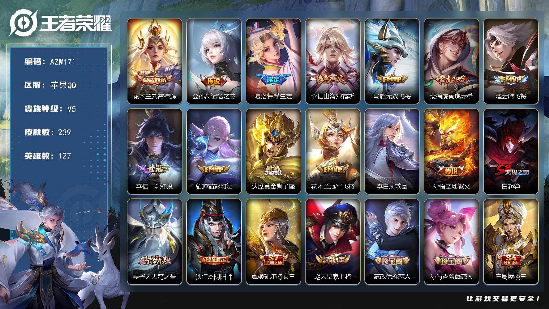 【AZW171】苹果Q-V5-最强王者段位-127英雄-239皮肤-1典藏皮肤