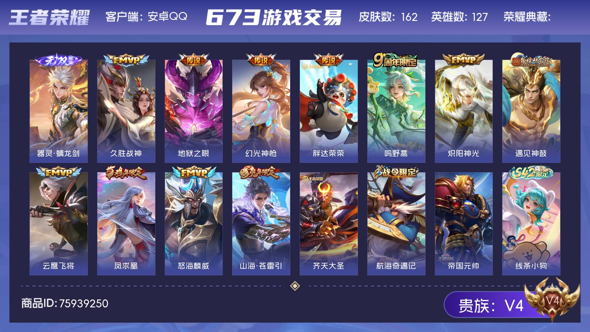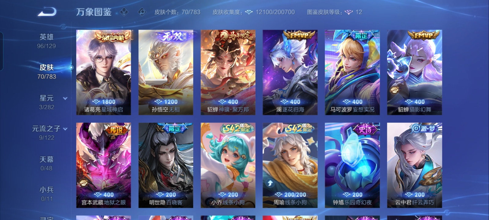 V10 皮肤502 英雄127 无双王者 荣耀典藏7 无双皮肤1 传说69 其他皮肤432