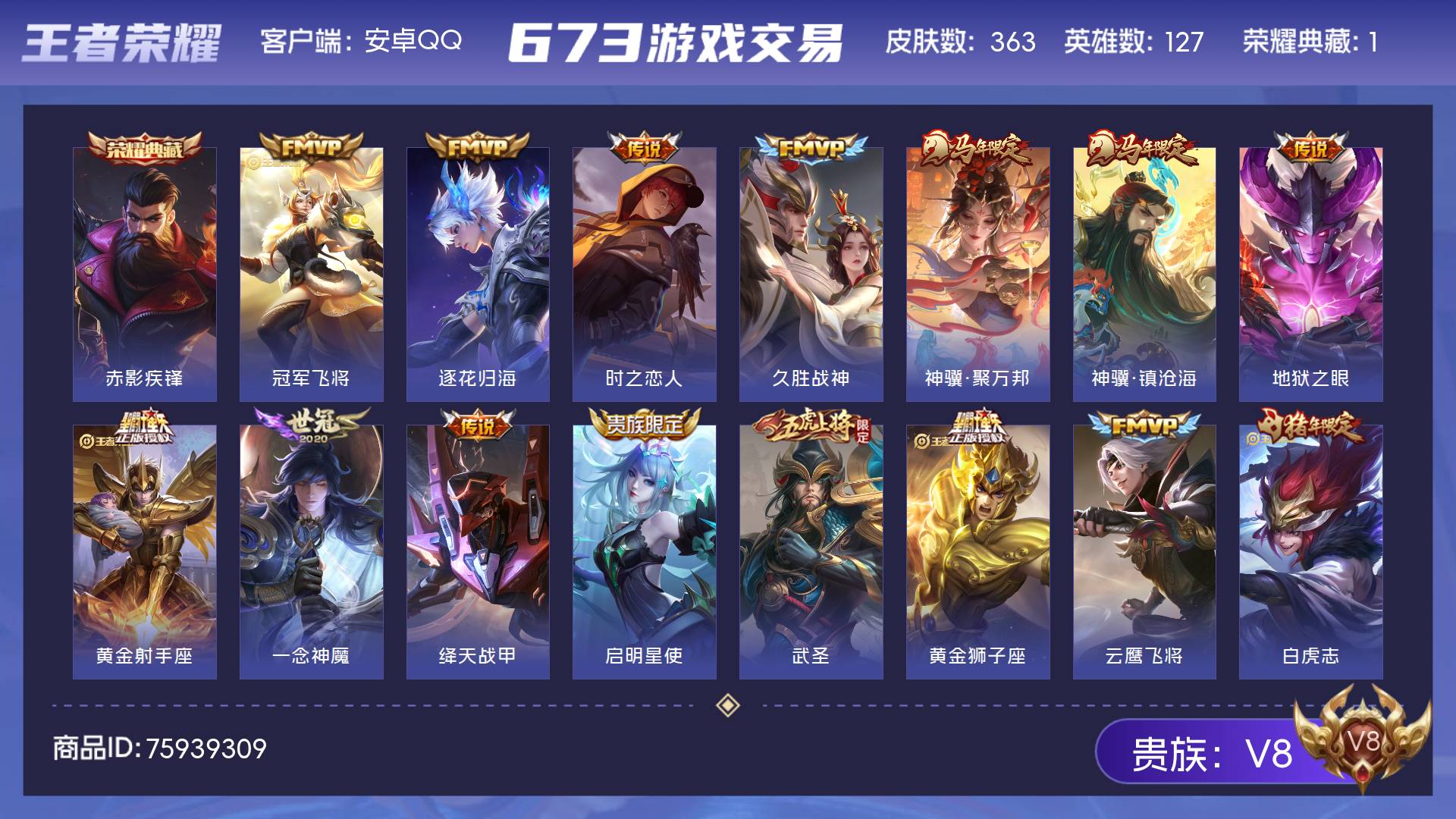 V8 皮肤365 英雄128 绝世王者 荣耀典藏2 珍品传说2 星传说3 传说33 其他皮肤334