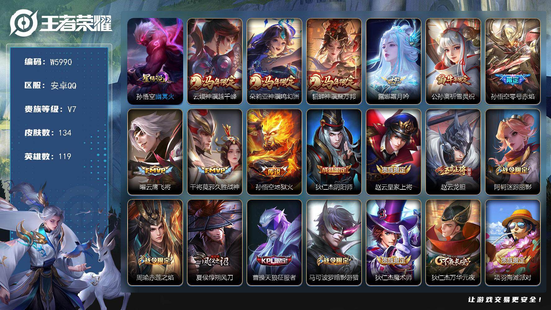 贵7-119英雄-134皮肤-1星元-9传说-44限定-3个性按键.贵族积分3.7万