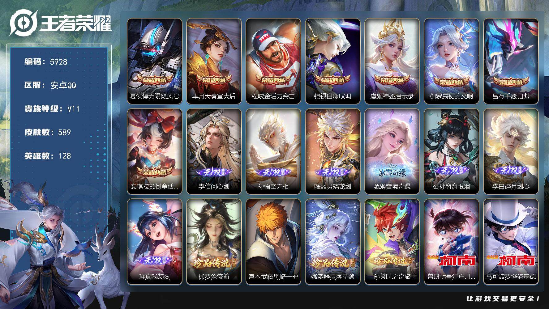 安卓WX-V8-最强王者段位-128英雄-201皮肤-1典藏皮肤-1无双-2珍品