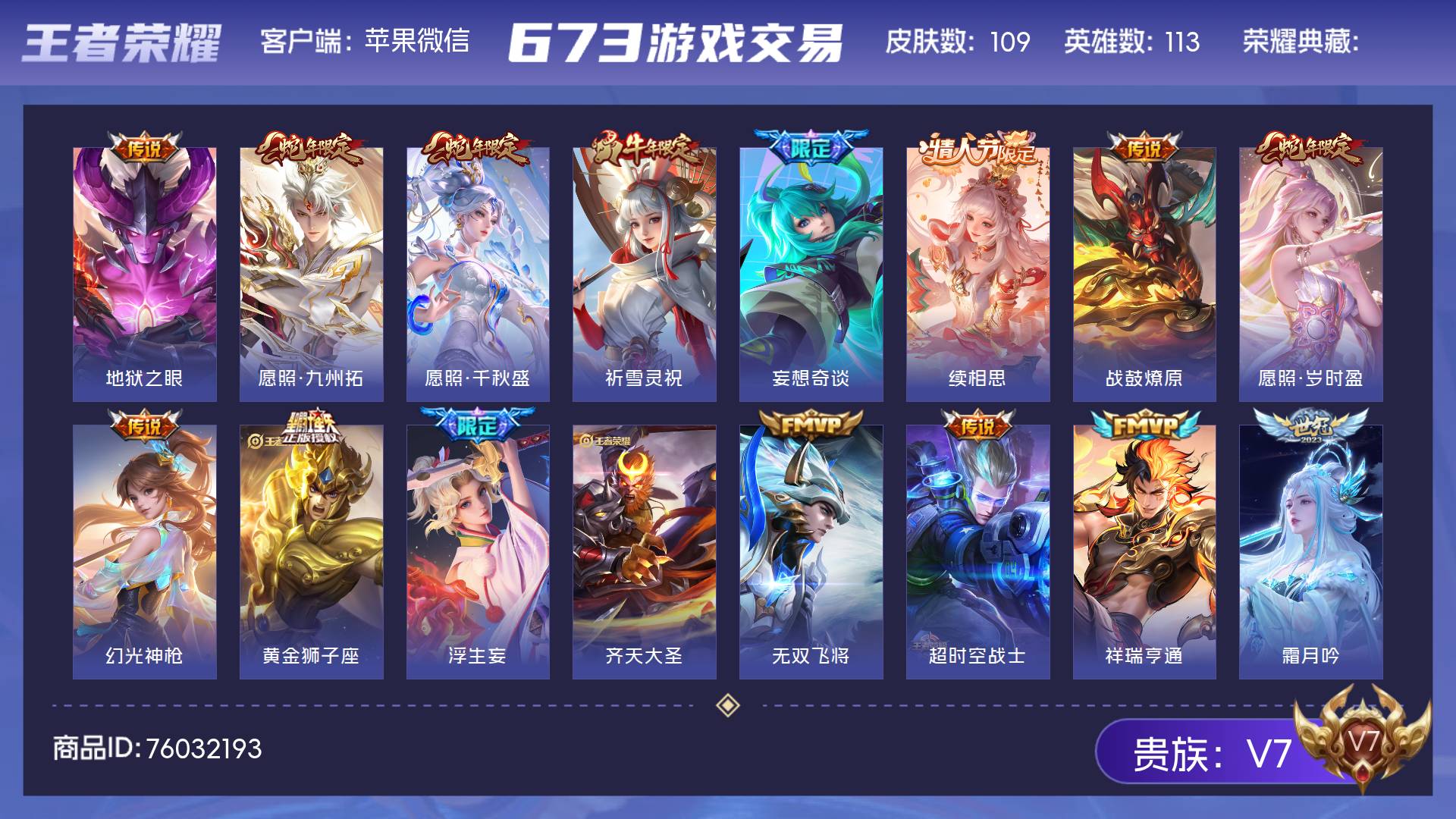 V7 皮肤109 英雄113 非凡王者 星传说1 传说16 其他皮肤100