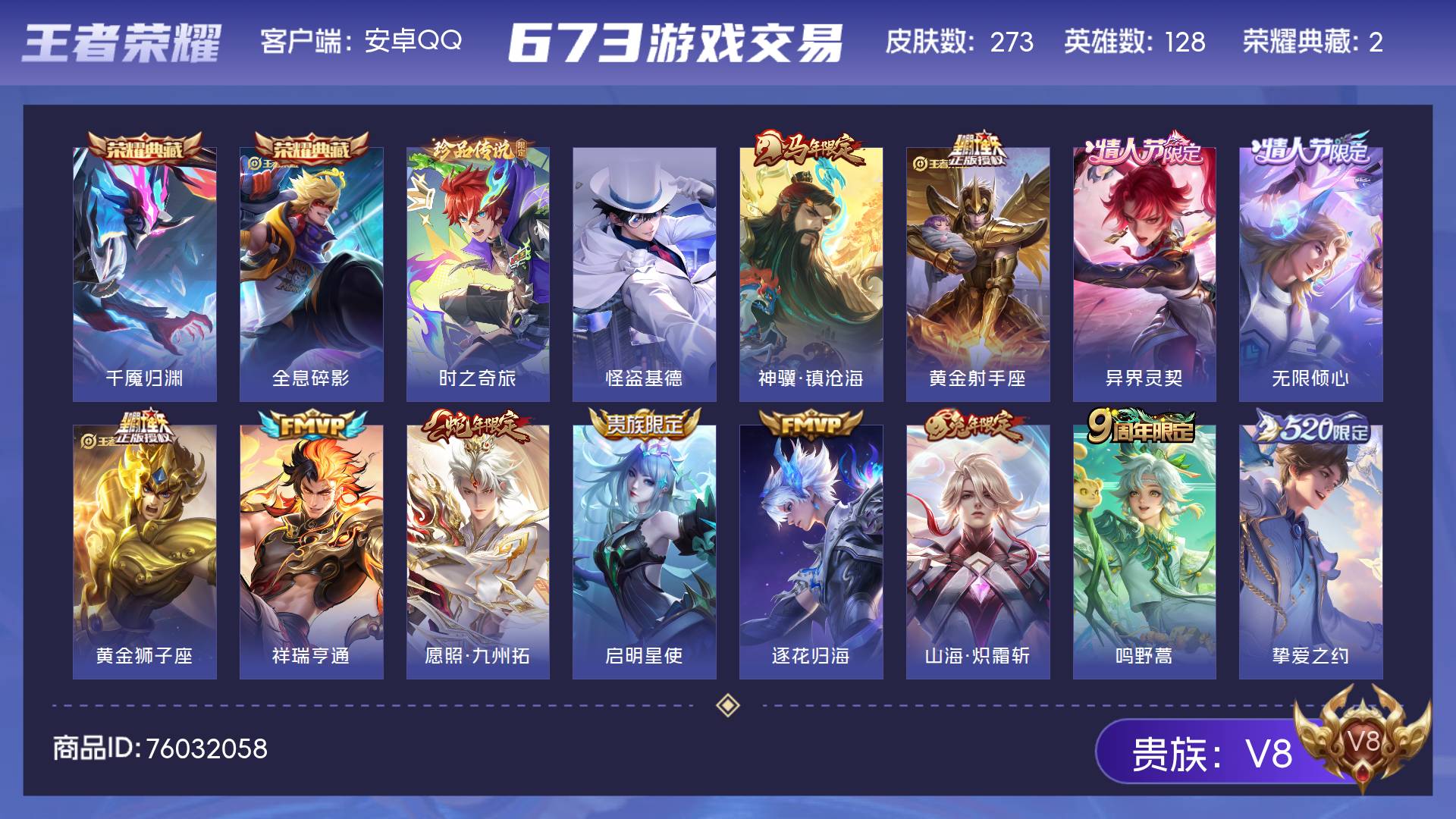 V8 皮肤273 英雄128 荣耀王者 荣耀典藏2 珍品传说2 传说23 其他皮肤253