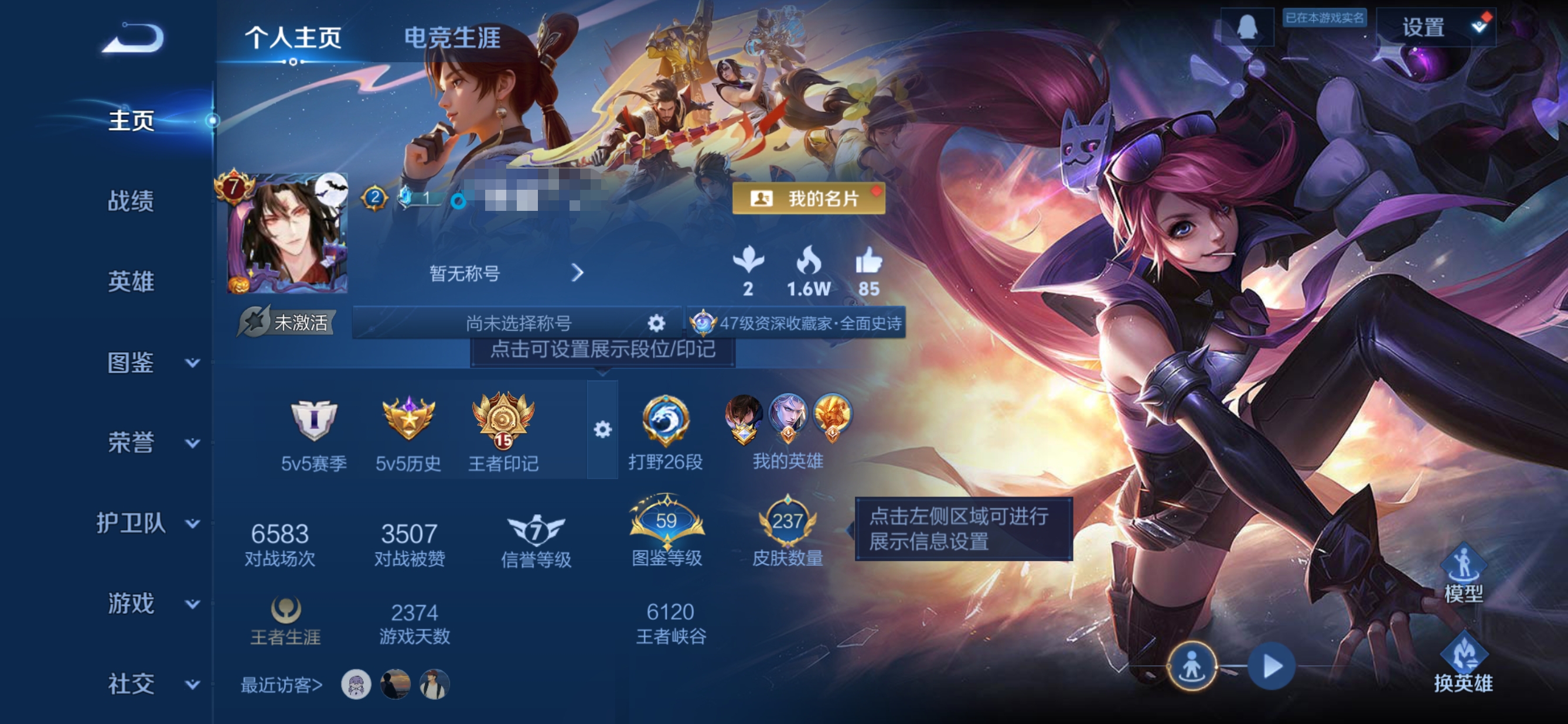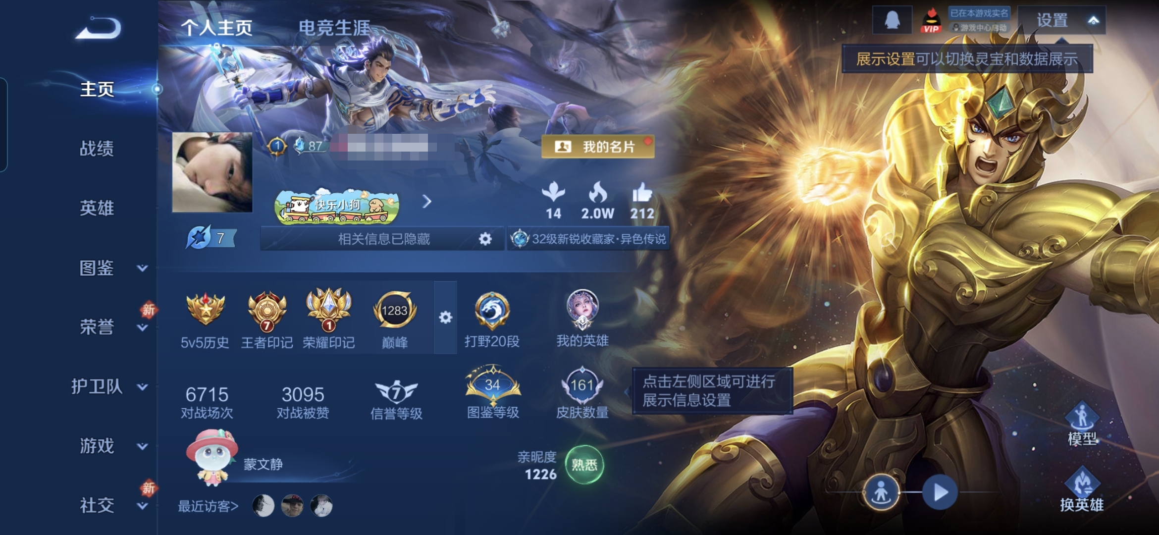实名: 可修改 贵族等级: V7 英雄数: 124 皮肤数: 170 荣耀水晶