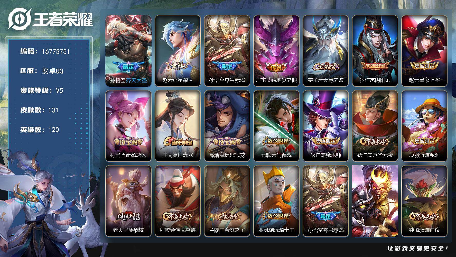 【16775751】安卓Q-V5-永恒钻石III段位-120英雄-131皮肤-