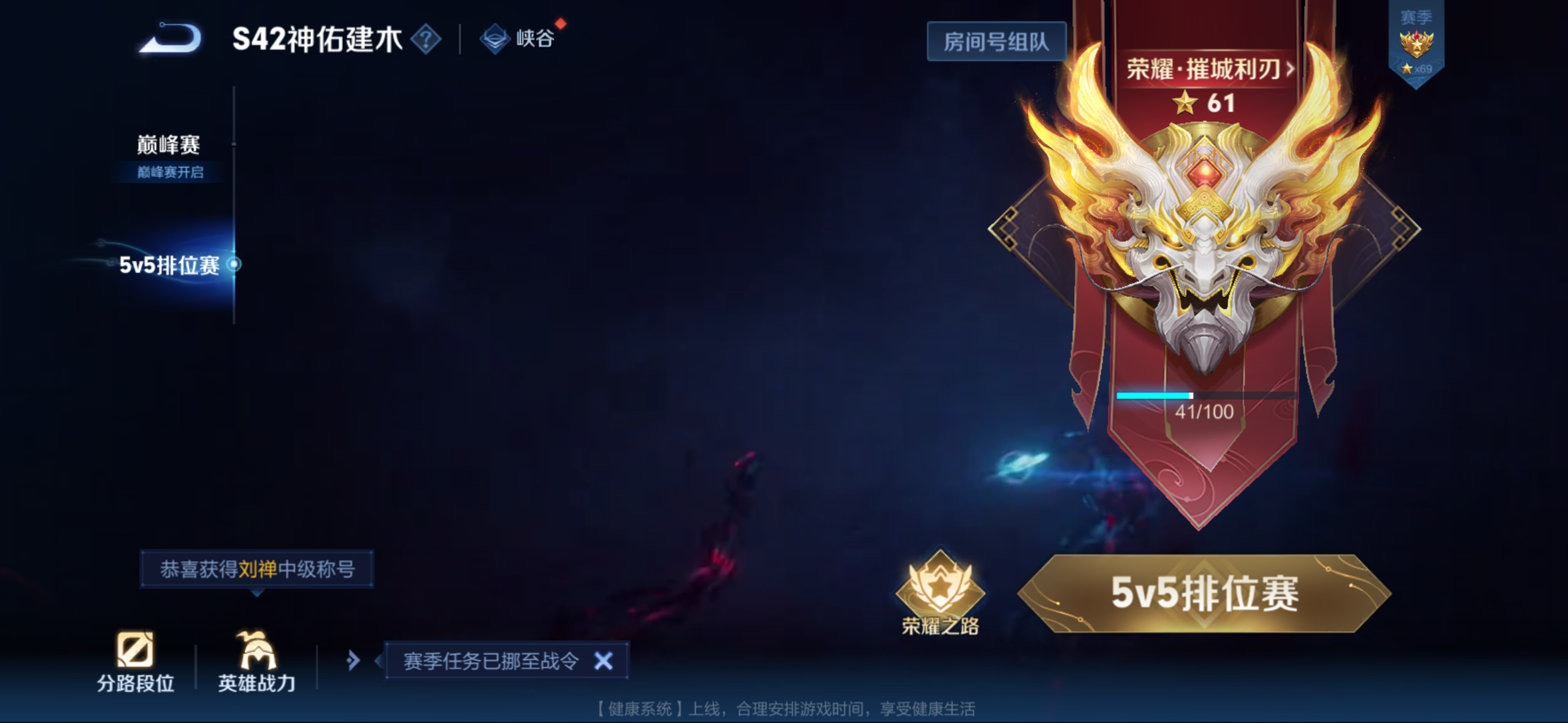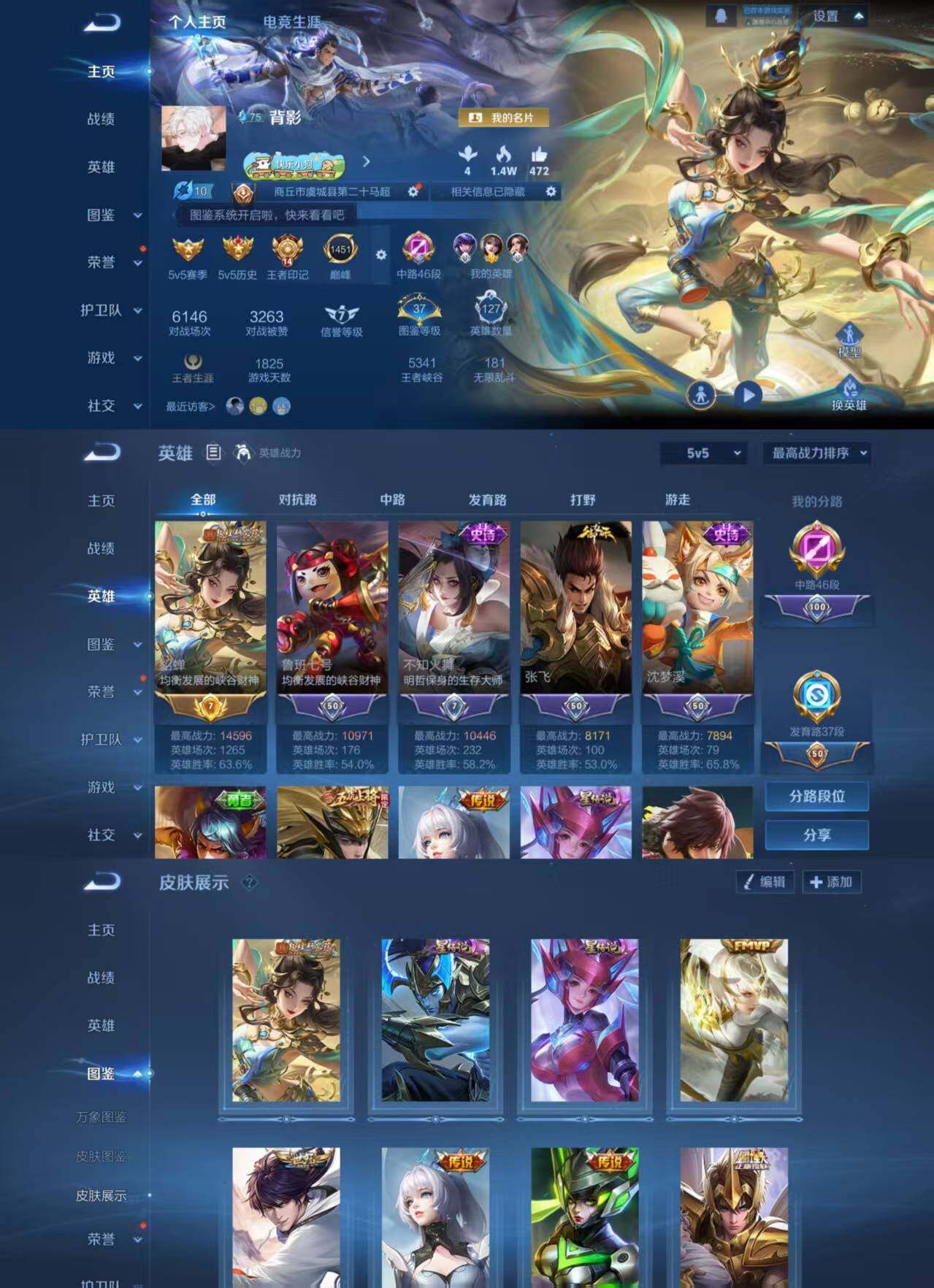 贵族等级: V5 英雄数: 126 皮肤数: 108 传说皮: 久胜战神,一念