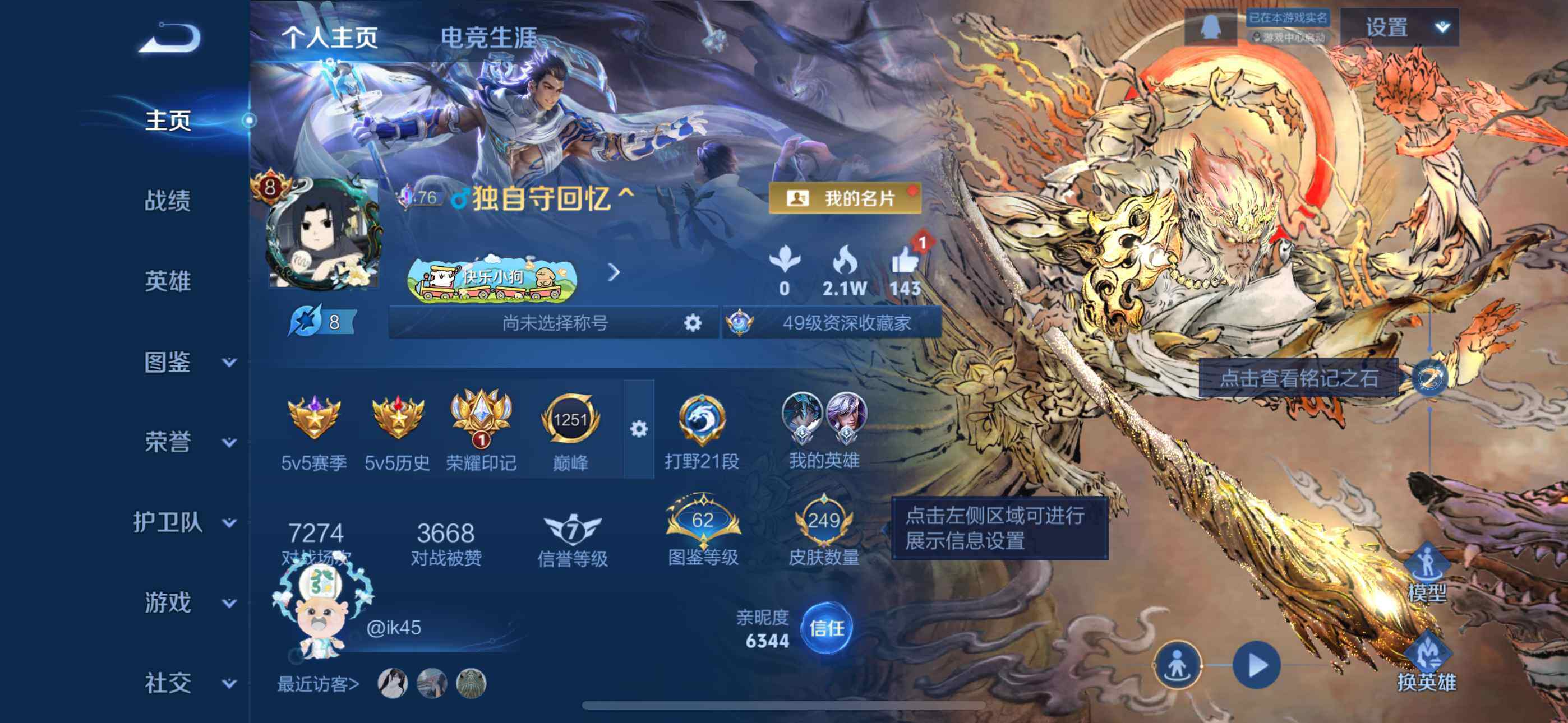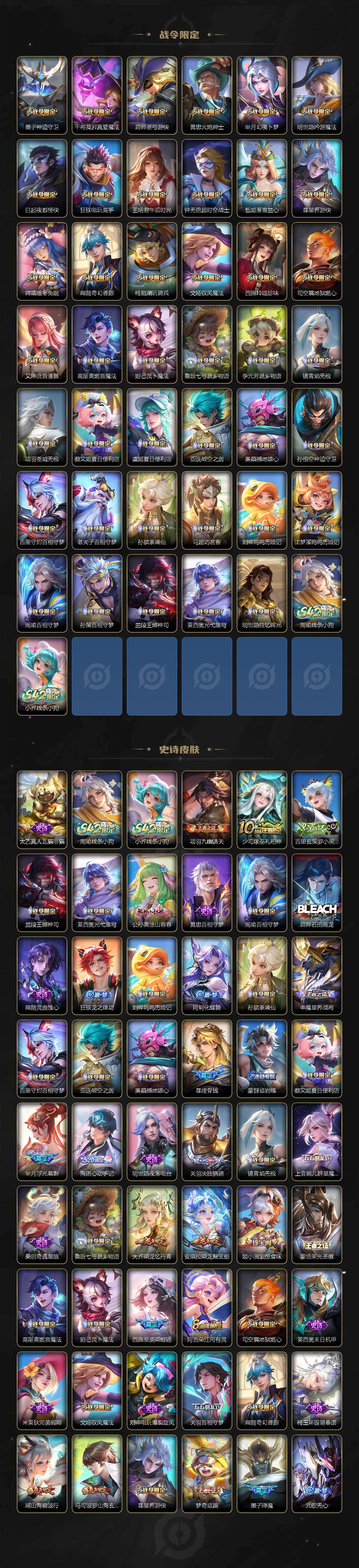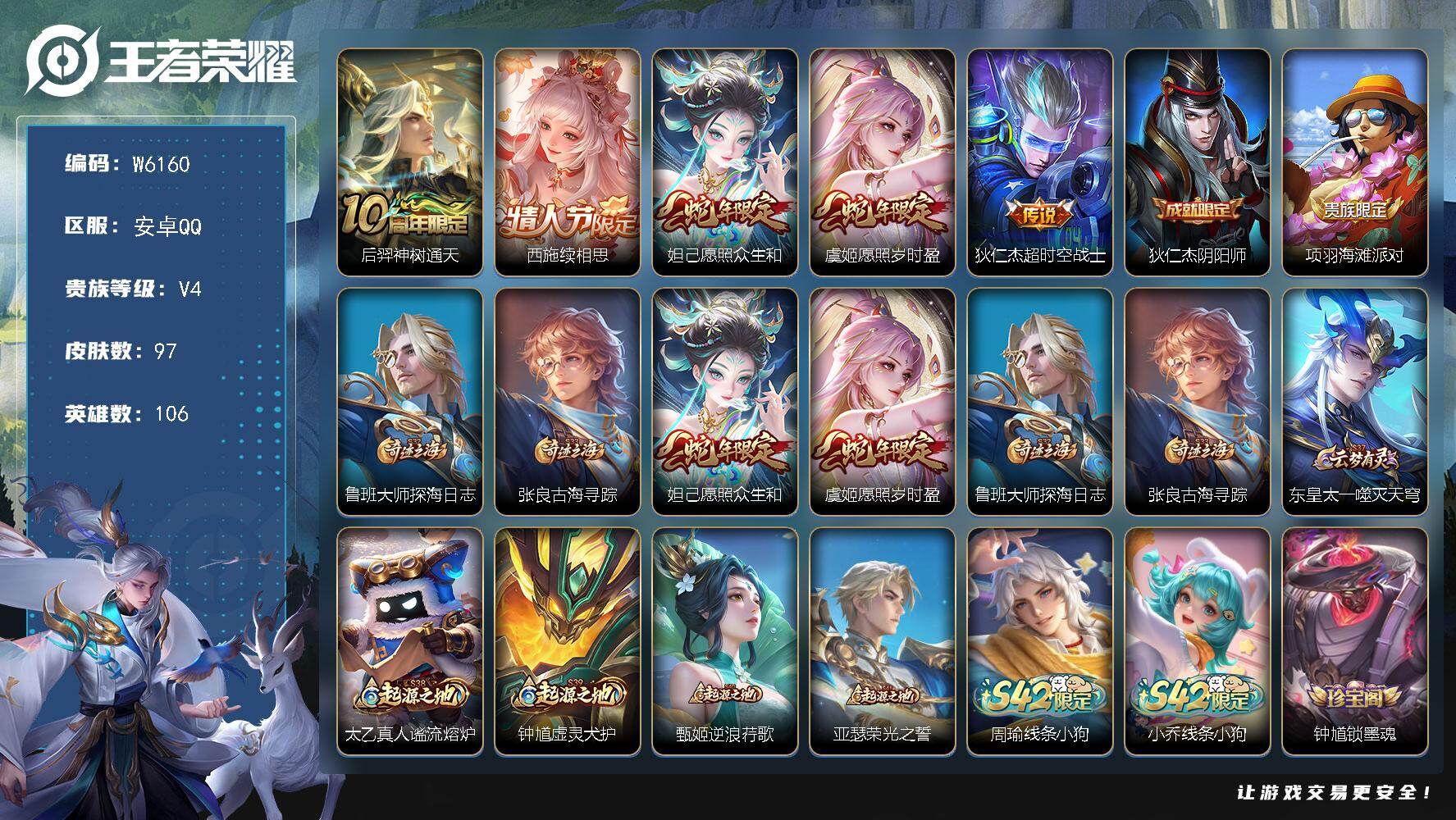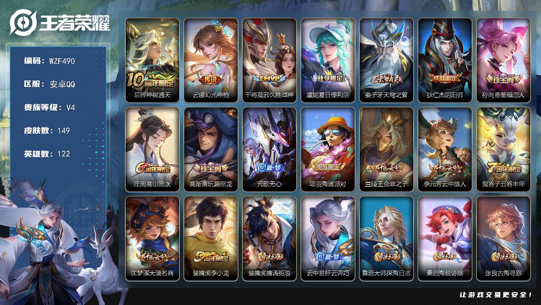 贵族4/皮肤149/传说3/史诗35/英雄122/空空儿全皮/后