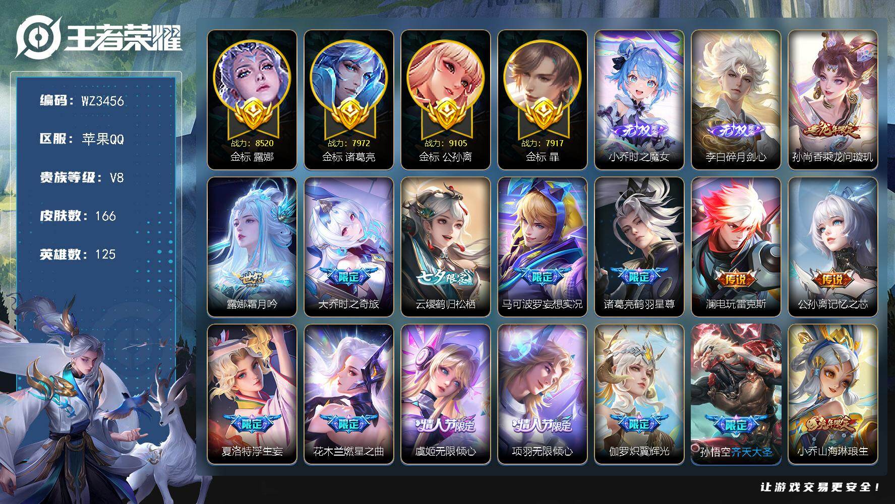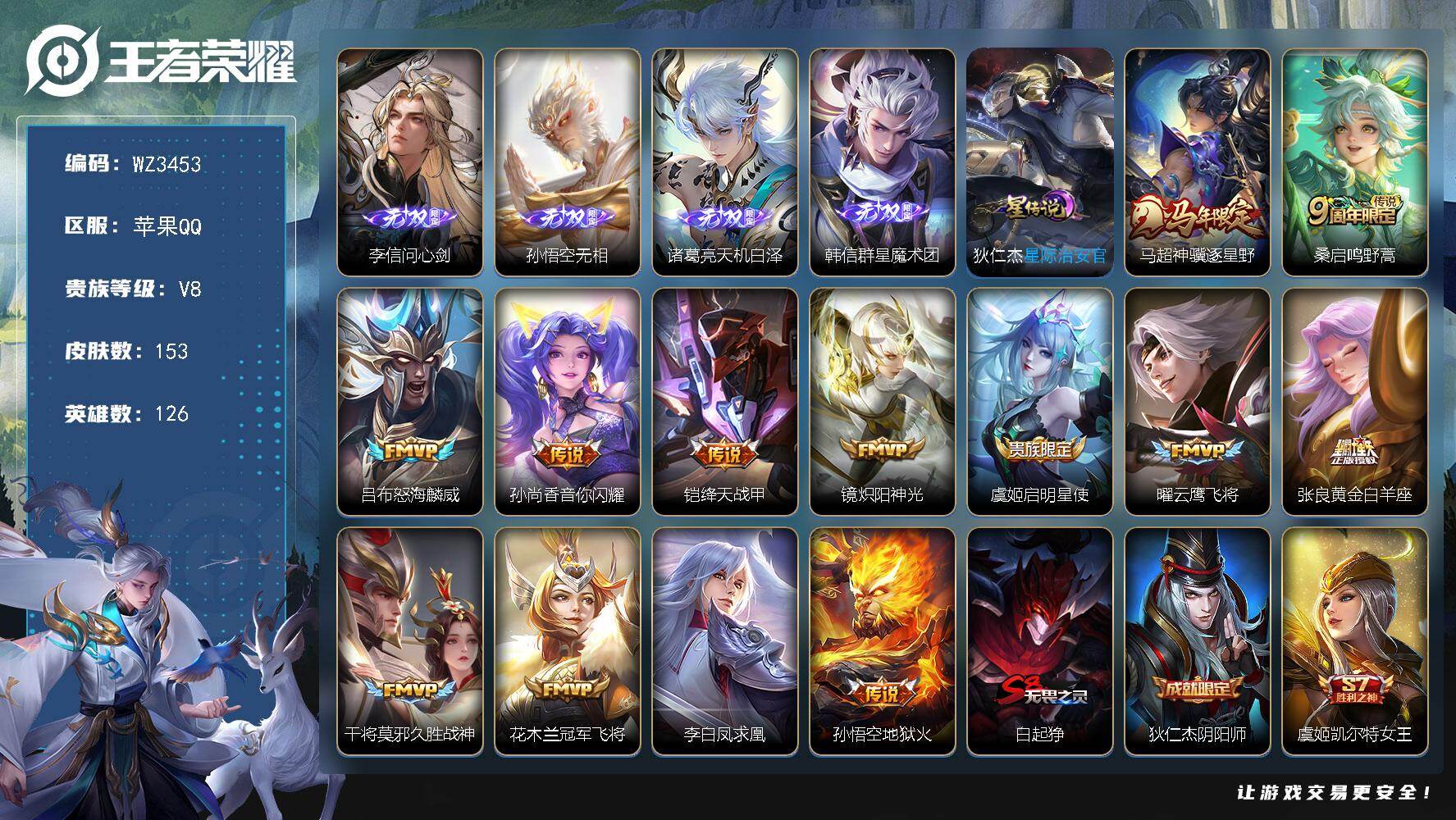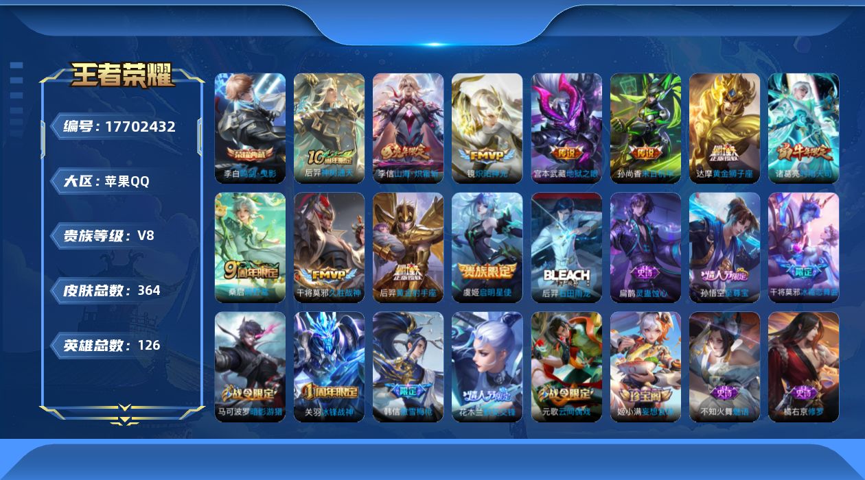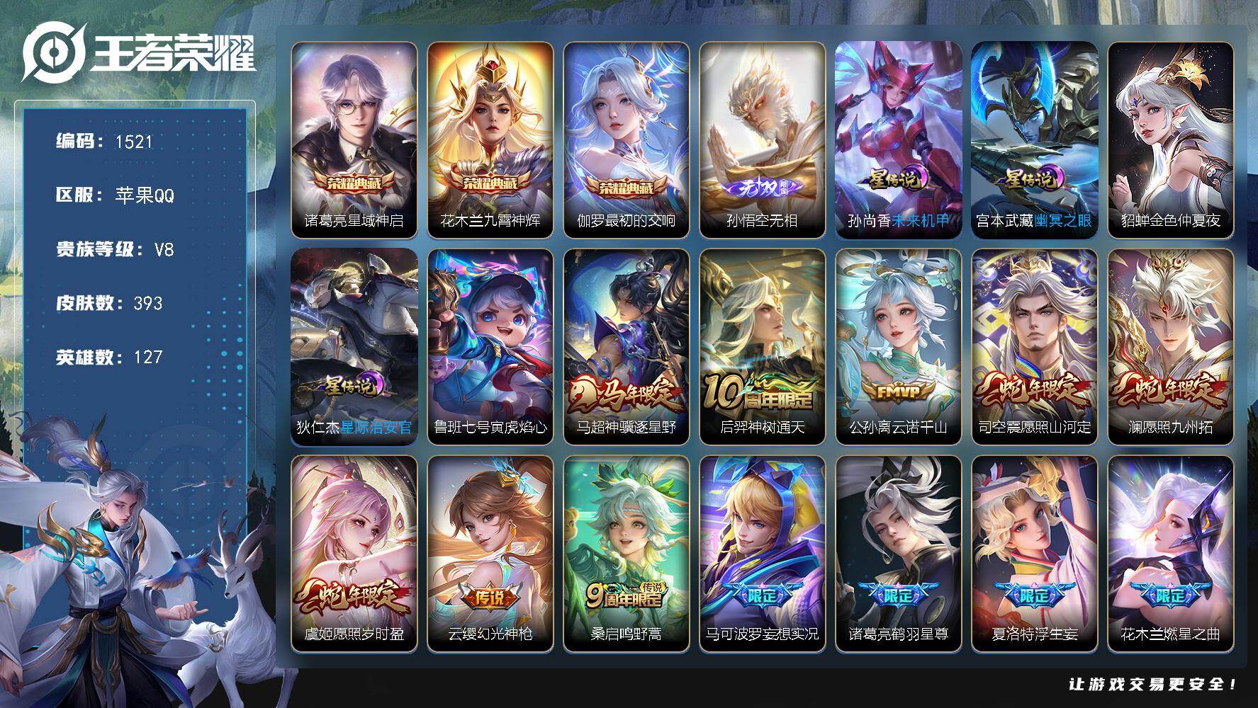 苹果Q-V8-最强王者段位-127英雄-393皮肤-3典藏皮肤-1无双-34传说