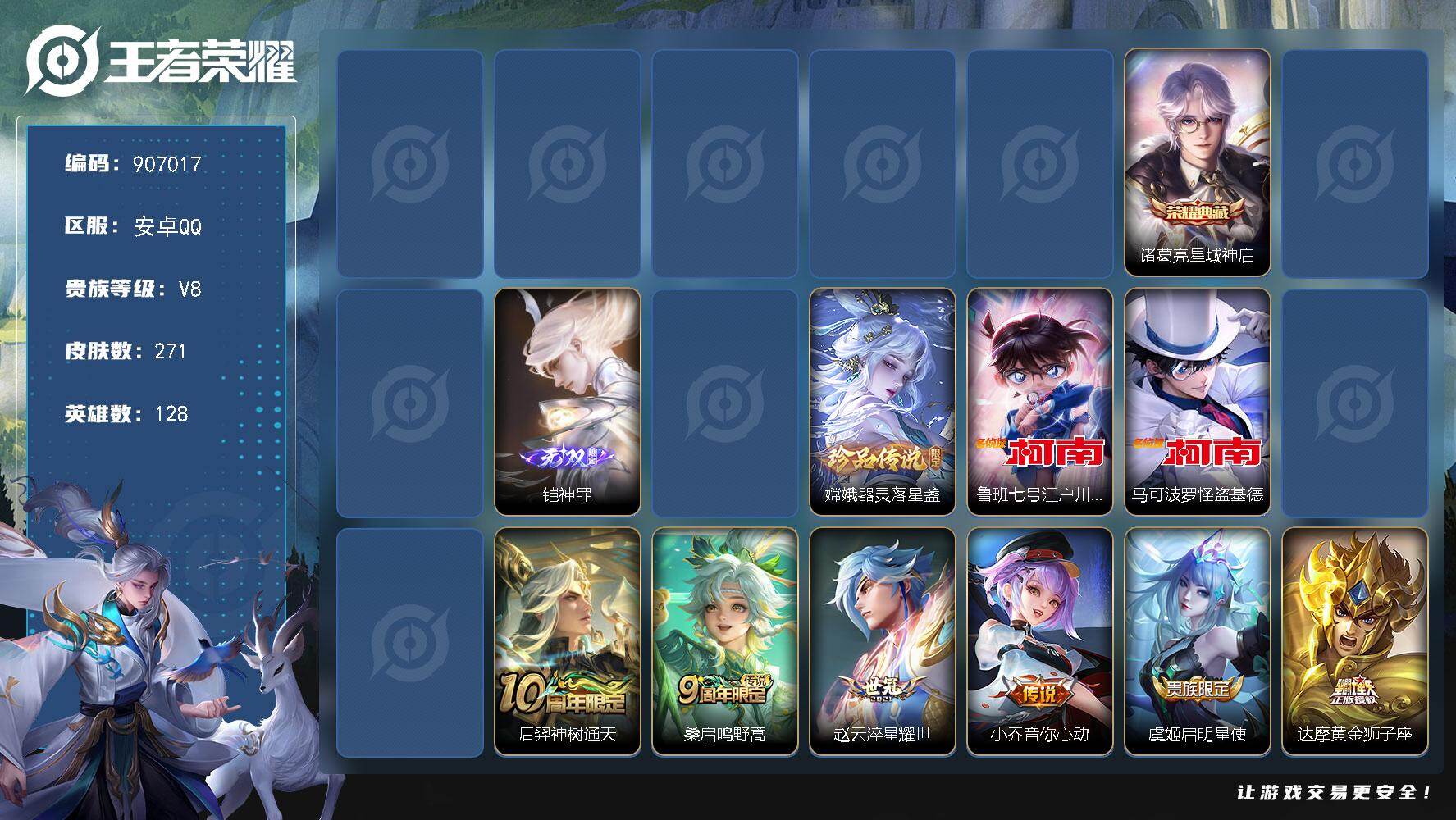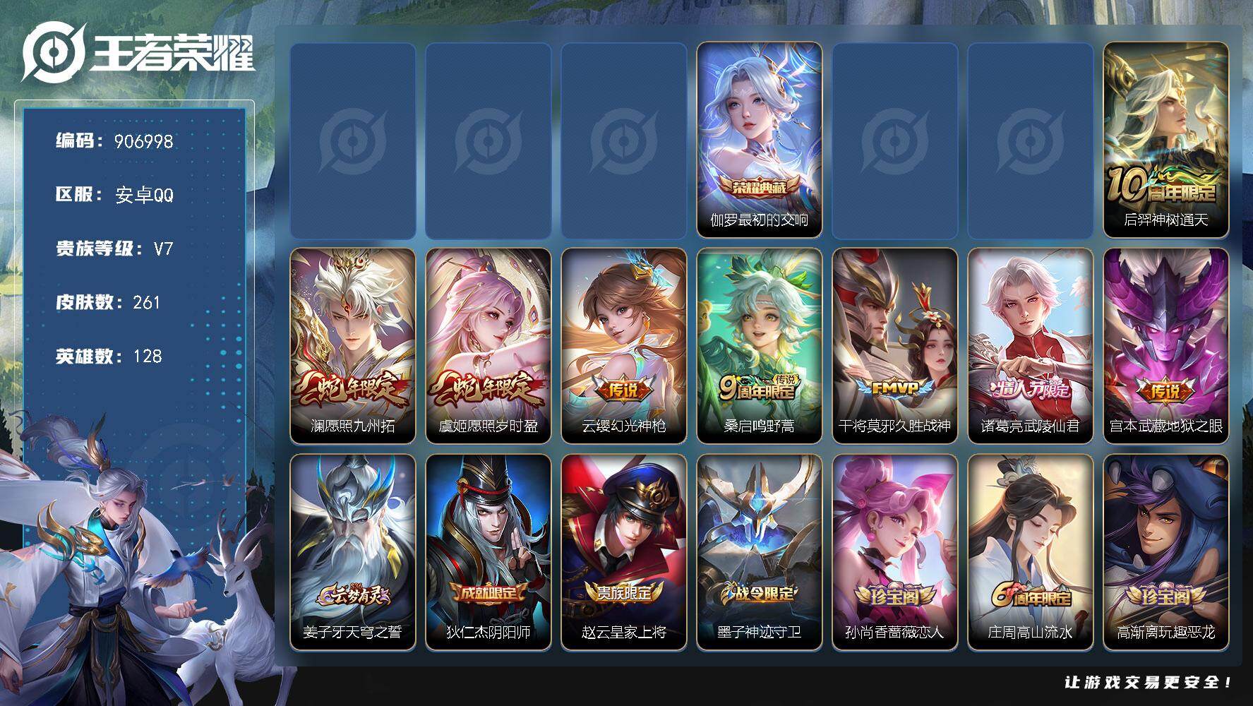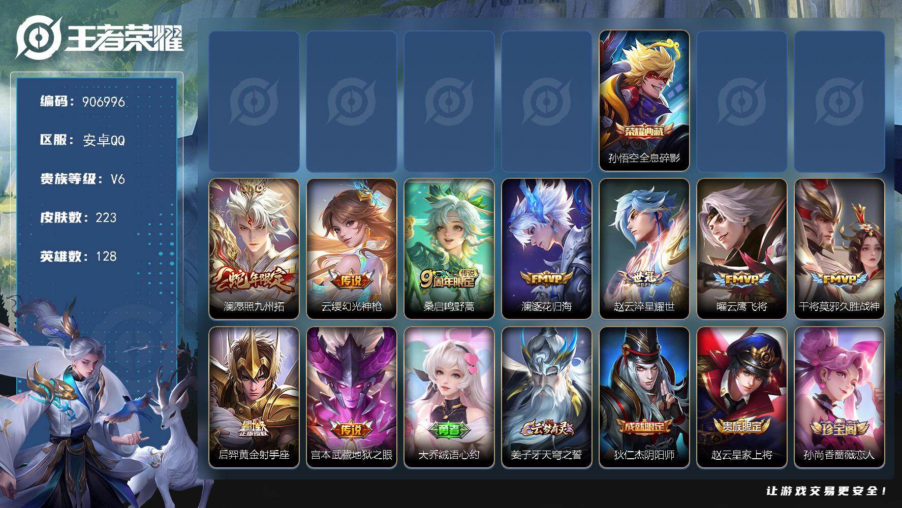 【金标司空震】实名: 可修改 贵族等级: V9 英雄数: 128 皮肤数: 3