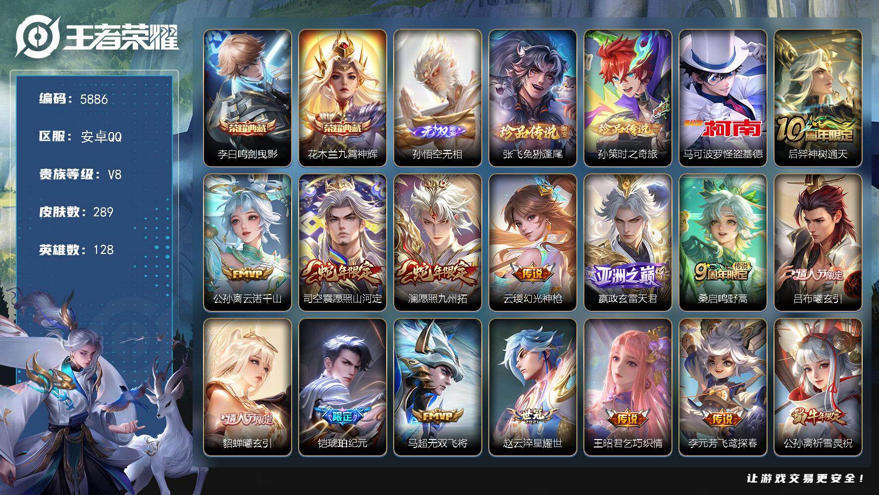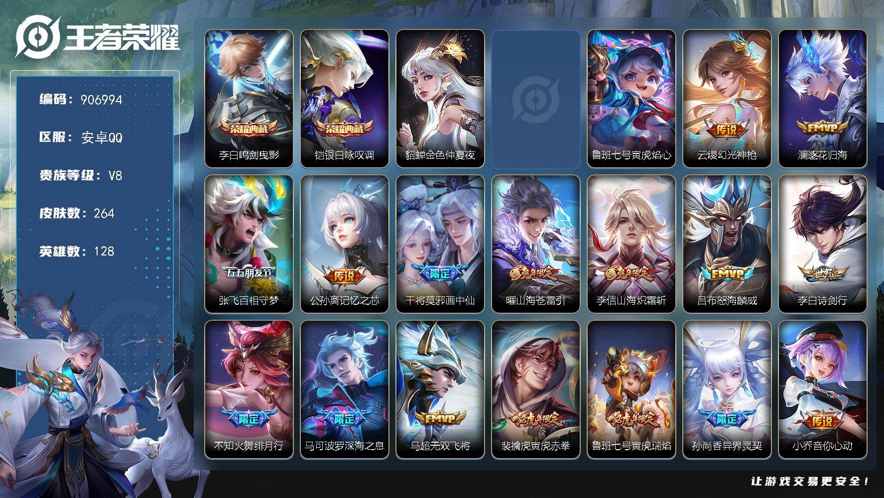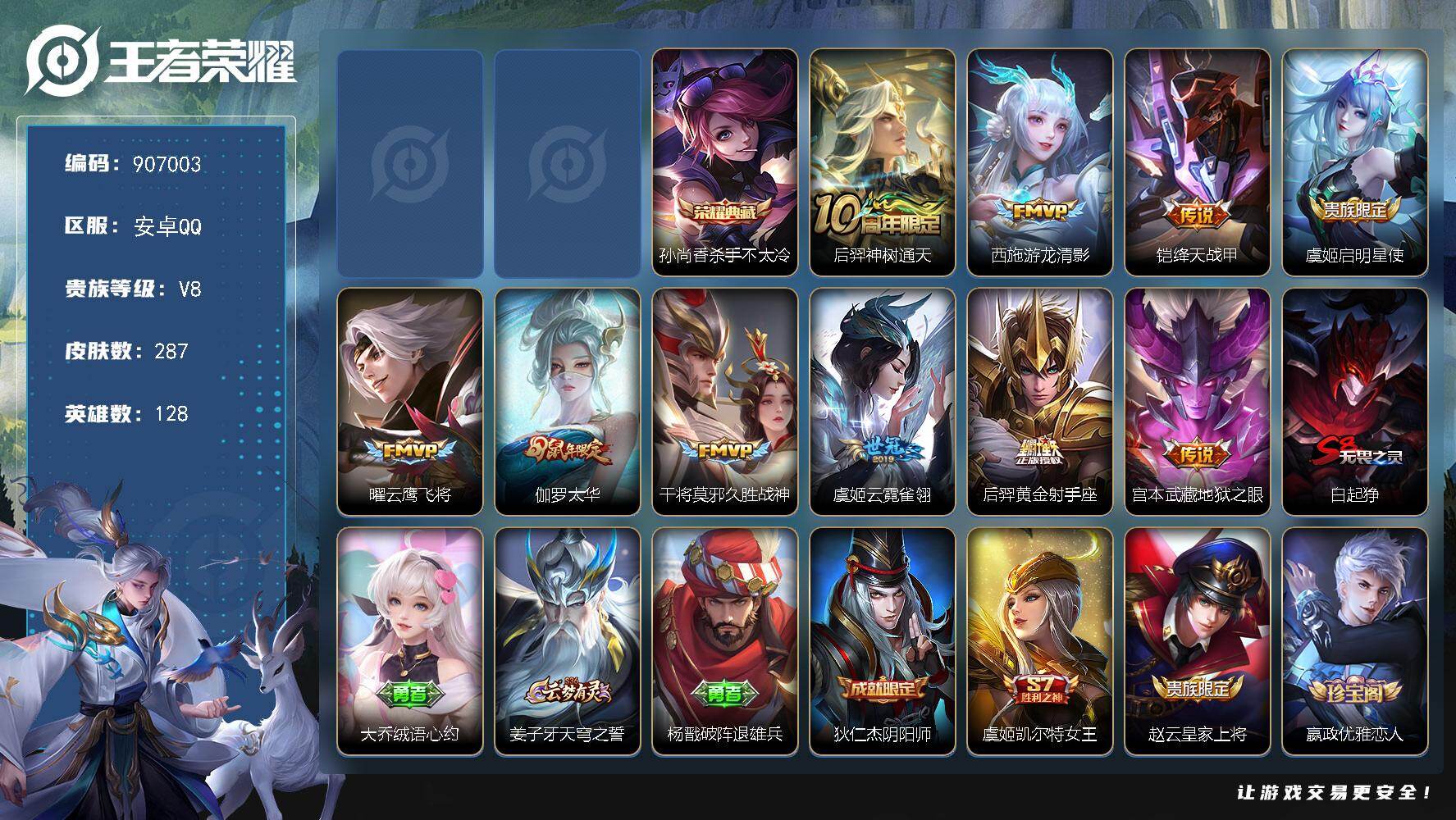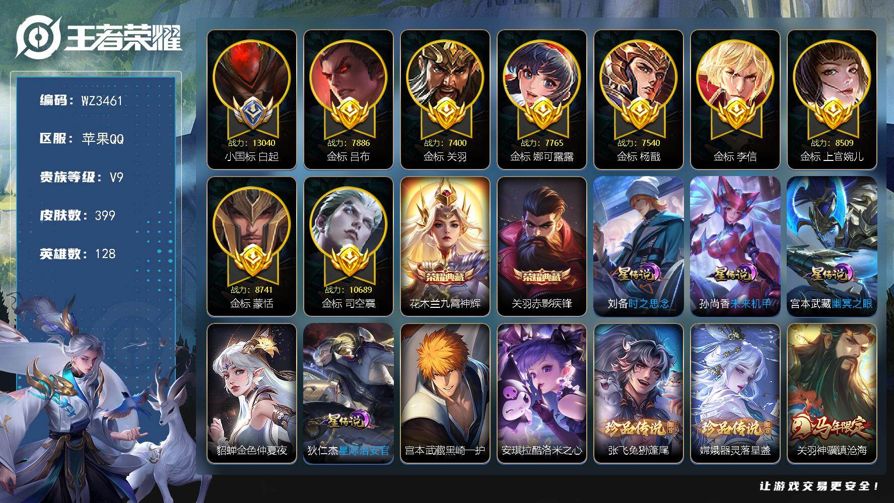 【金标司空震】实名: 可修改 贵族等级: V9 英雄数: 128 皮肤数: 3
