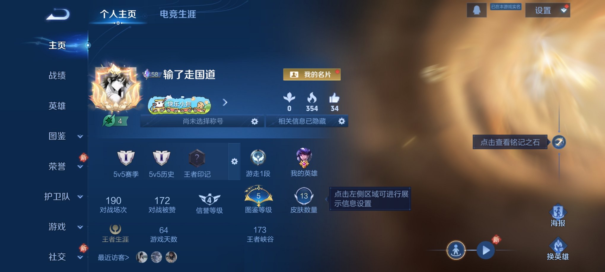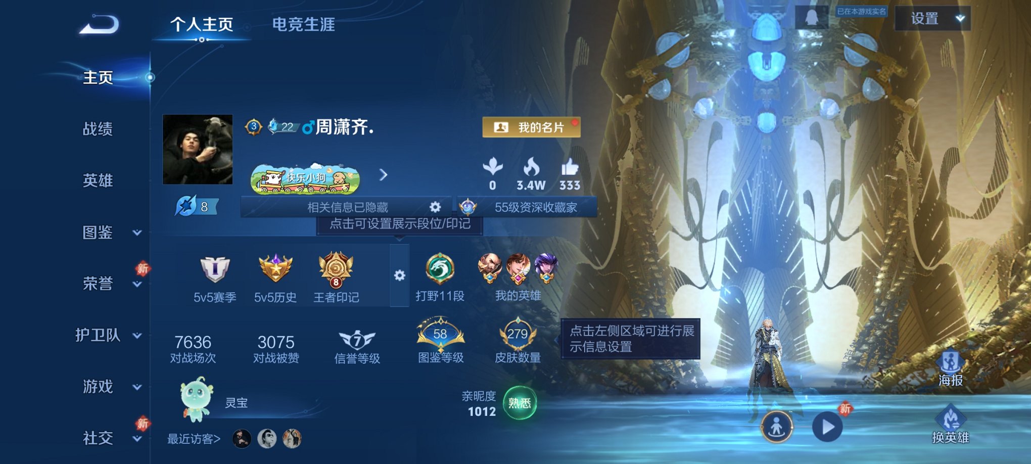实名: 可修改 贵族等级: V7 英雄数: 128 皮肤数: 315 荣耀水晶