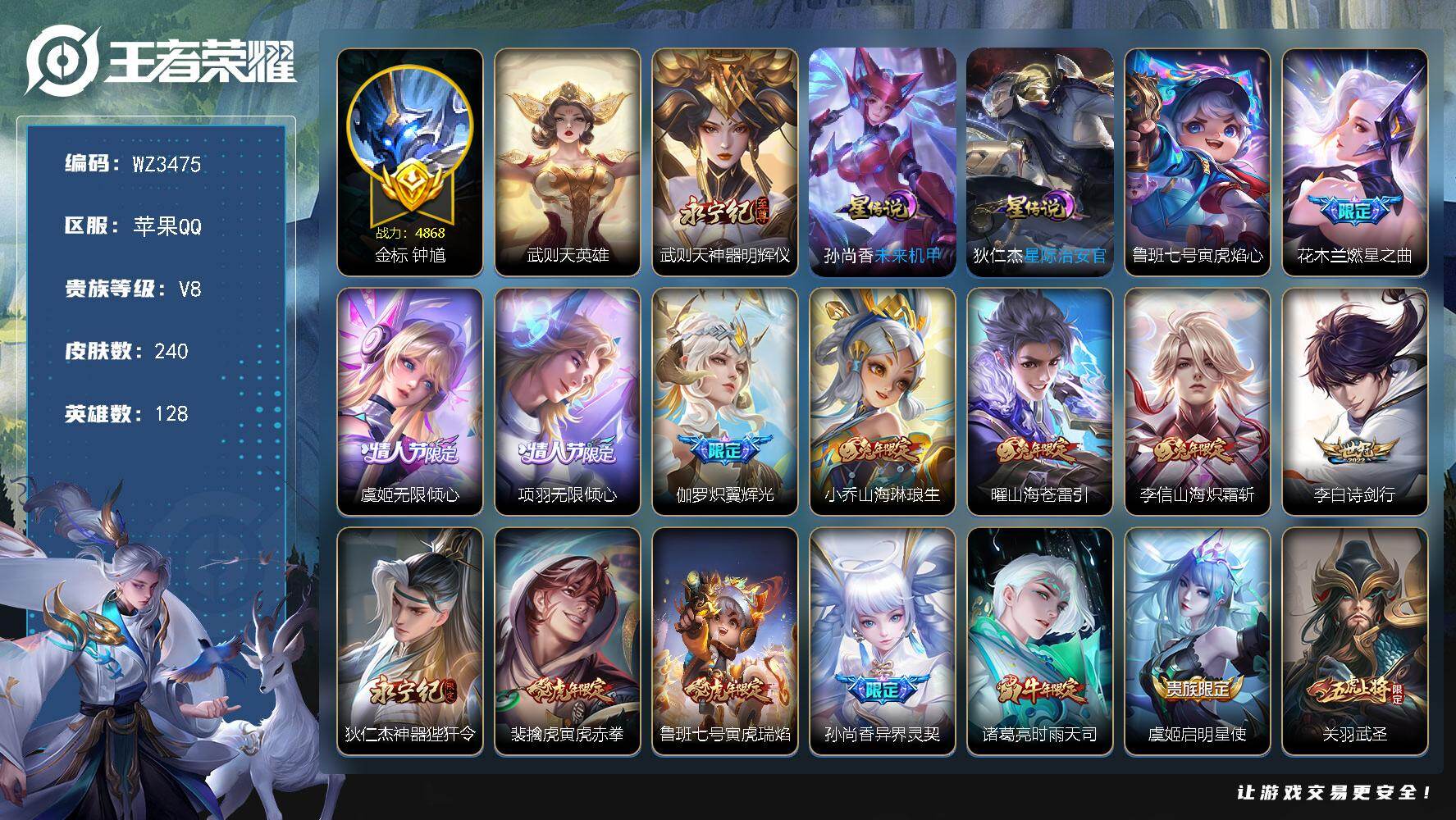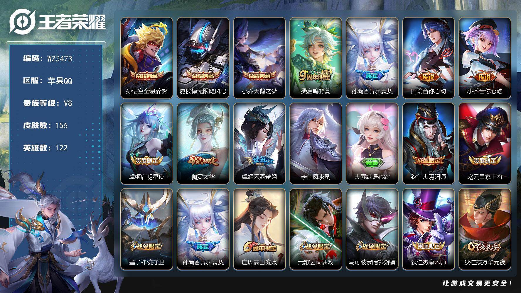 iosq区1.45w貂蝉,万战火舞,万战鲁班,蓝宫本,孙尚香粉机甲,孙悟空至尊宝