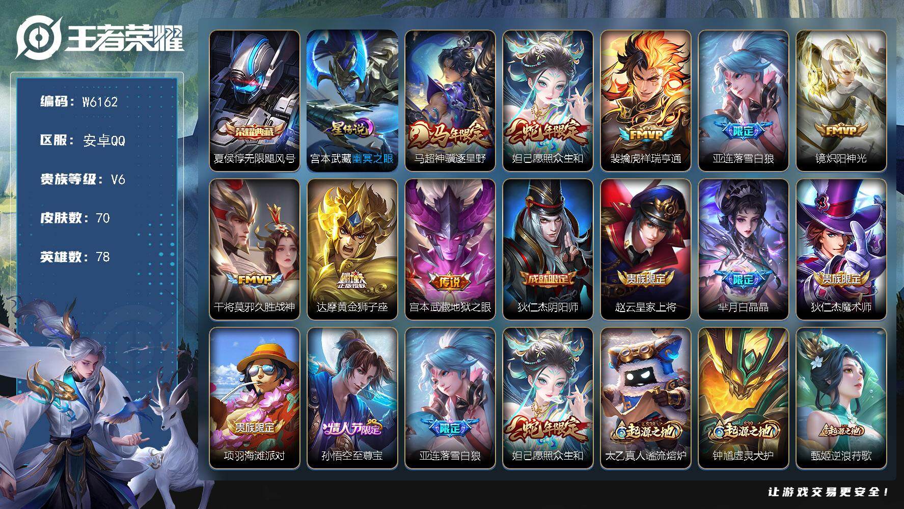 贵族等级: V4 英雄数: 64 皮肤数: 25 传说皮: 地狱之眼,无双飞将