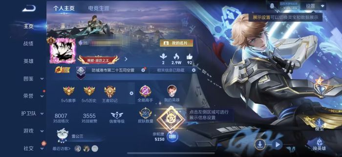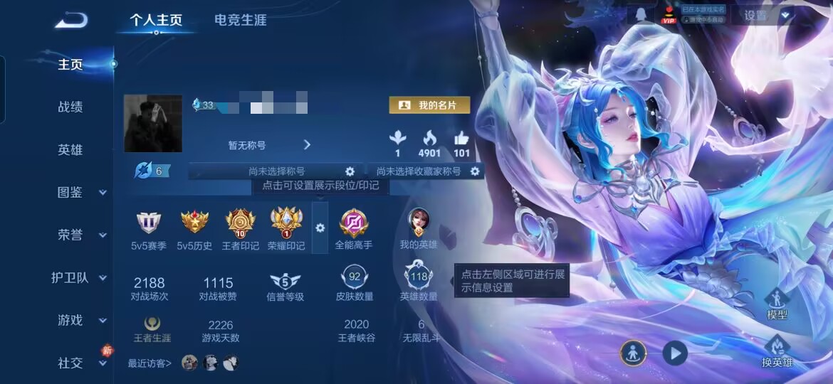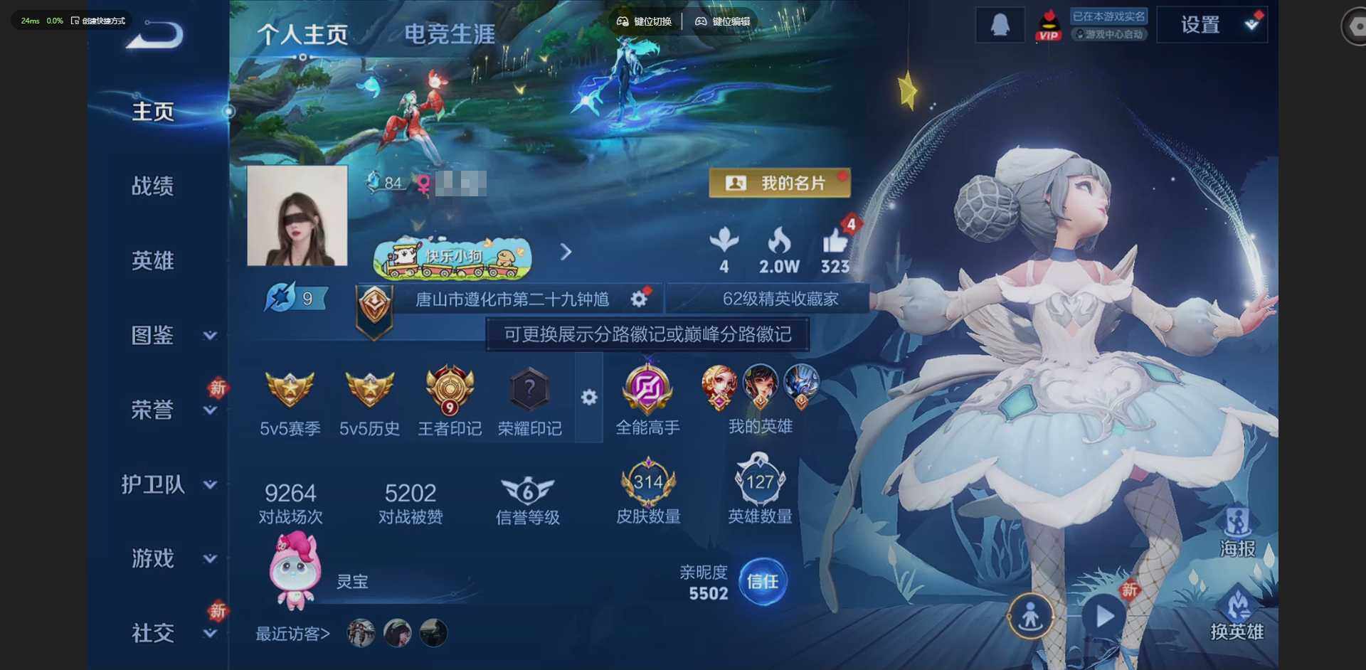 实名: 可修改 贵族等级: V8 英雄数: 127 皮肤数: 314 荣耀水晶