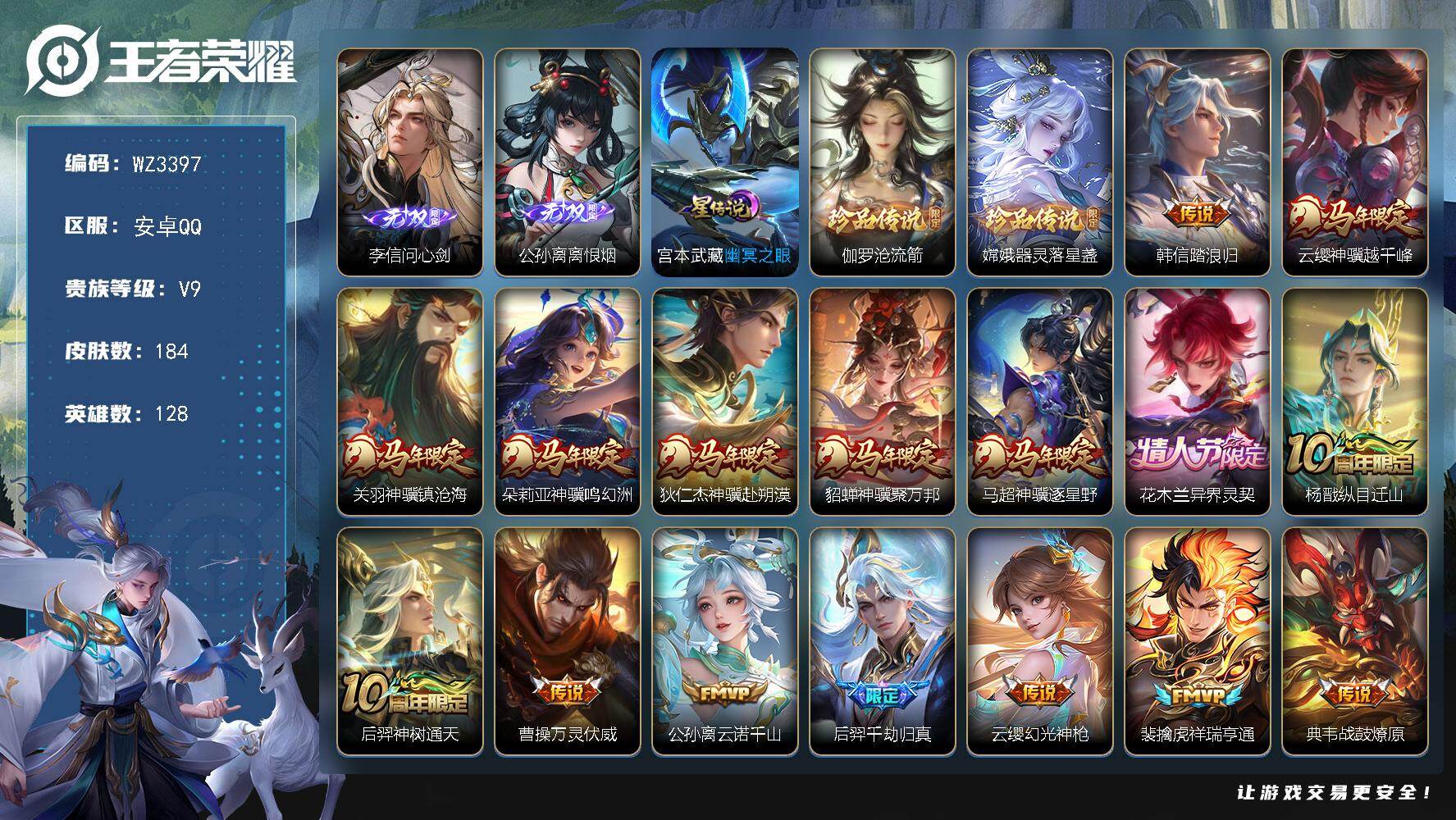 【秒换绑】安卓Q-V9-最强王者段位-128英雄-184皮肤-2无双-2珍品传