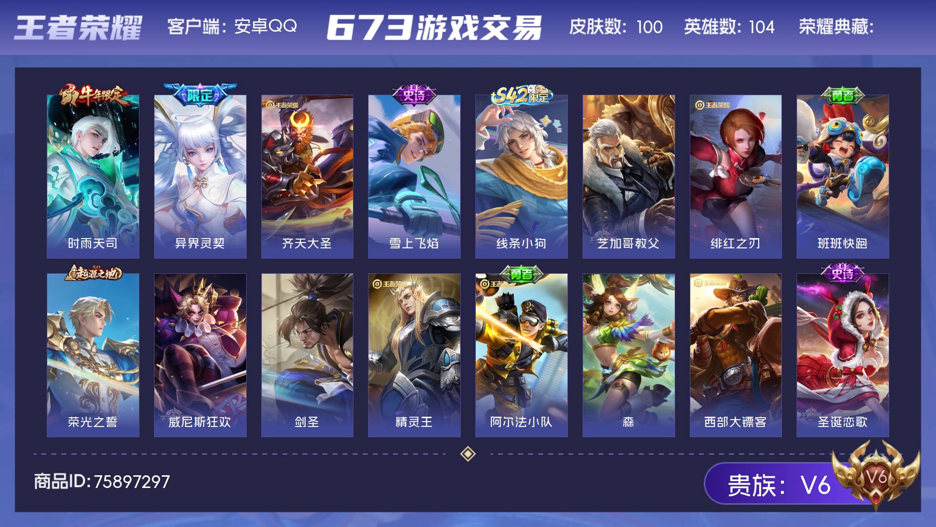 V6 皮肤100 英雄104 尊贵铂金 传说3 其他皮肤103