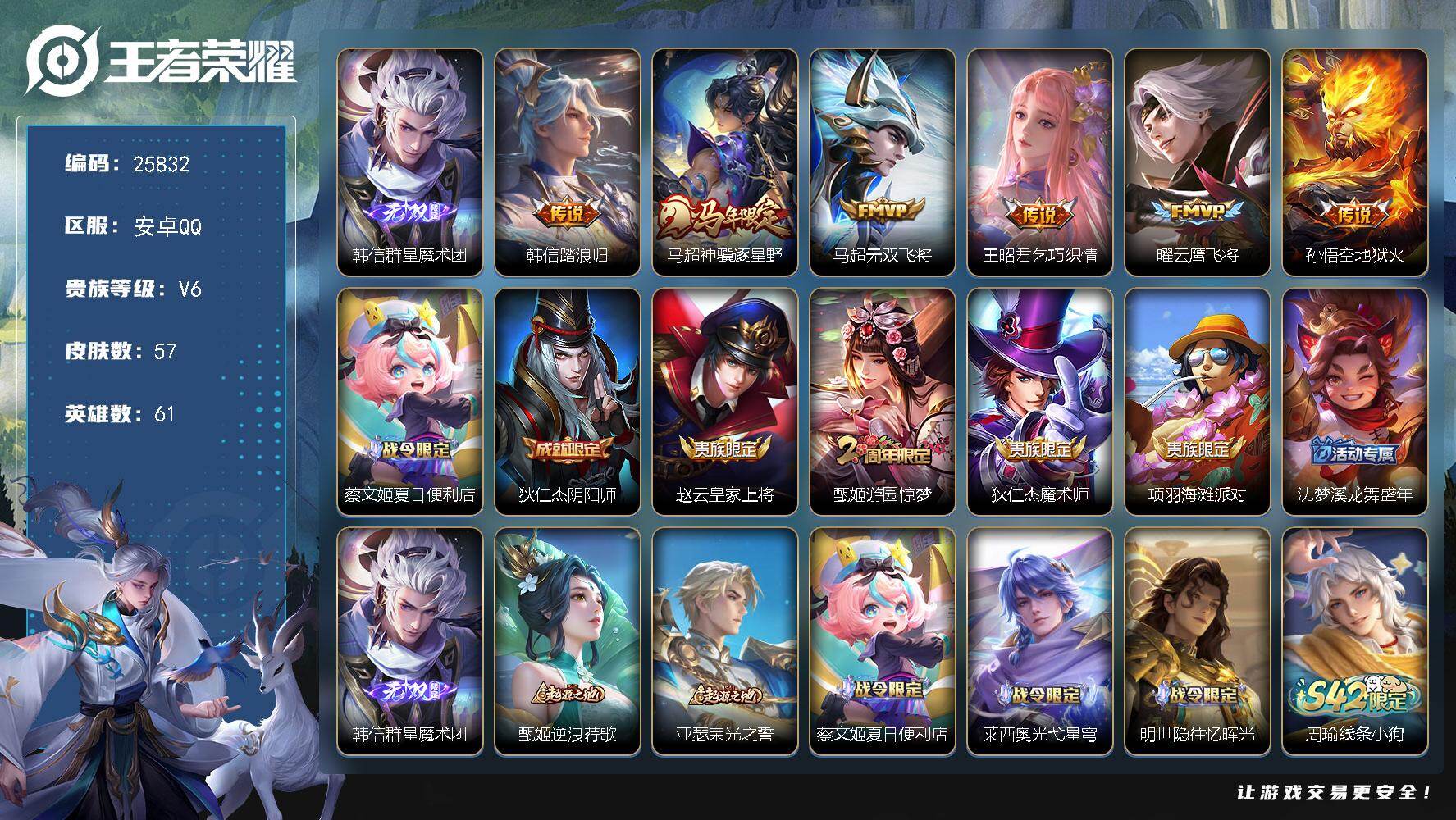 可换绑【精品小号·关羽孙悟空双典藏·韩信飞衡】3451星币 1星传说,2王者印