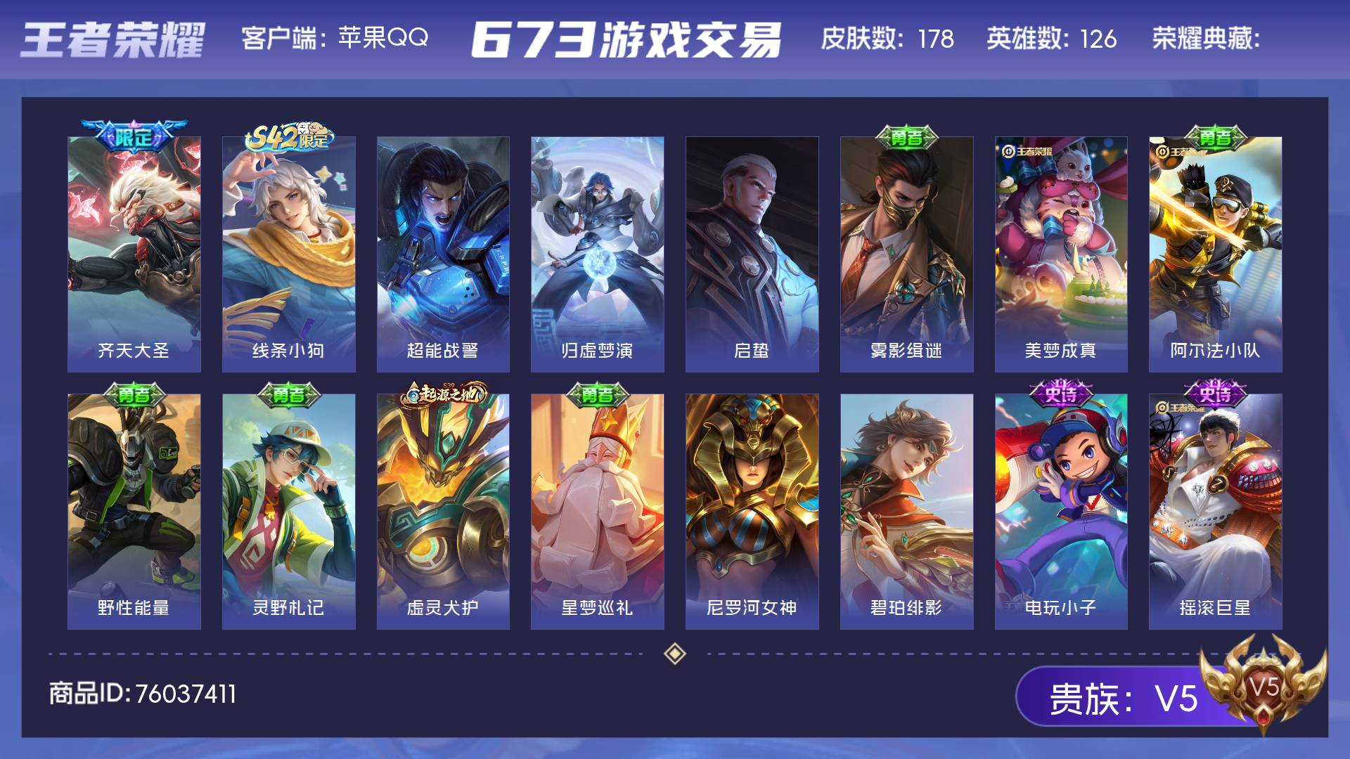 V5 皮肤178 英雄126 至尊星耀 传说1 其他皮肤183