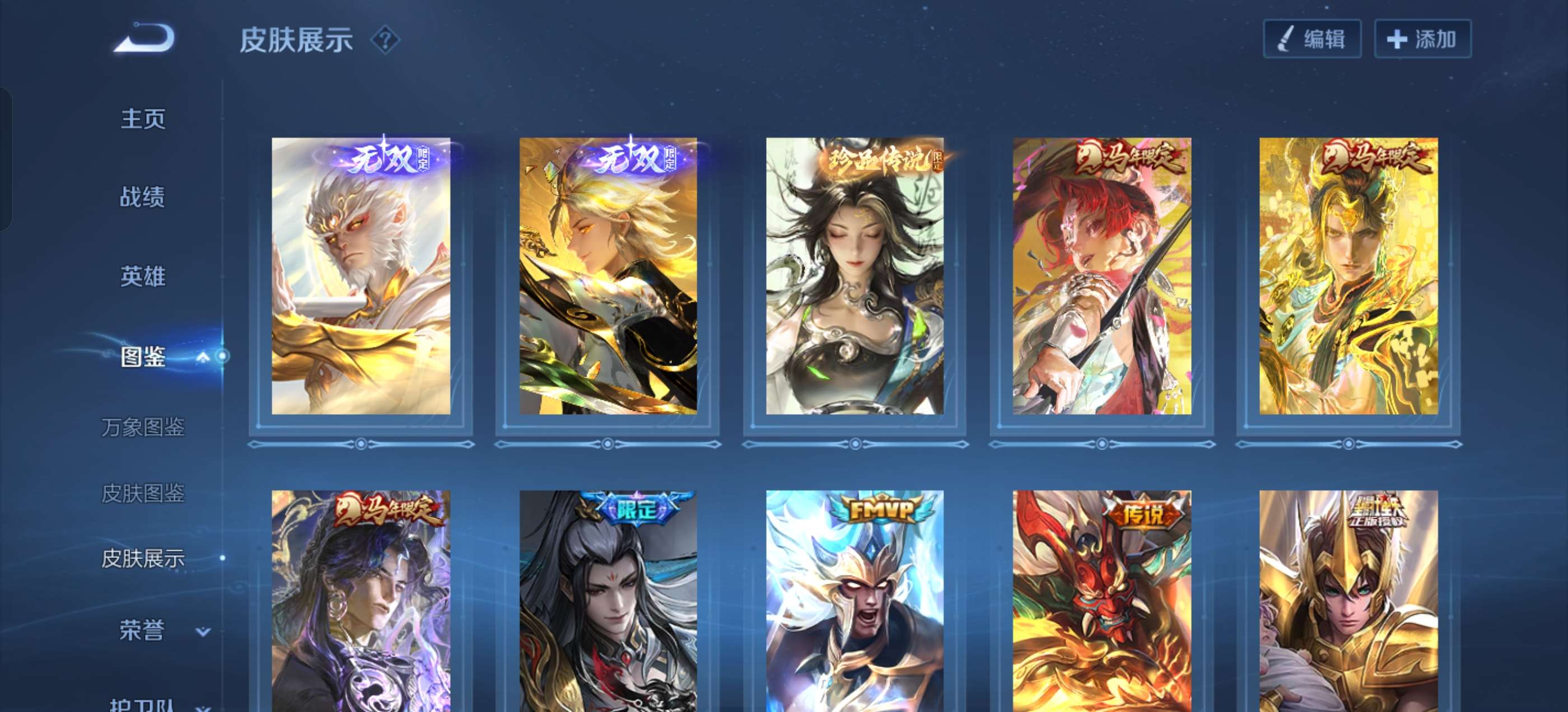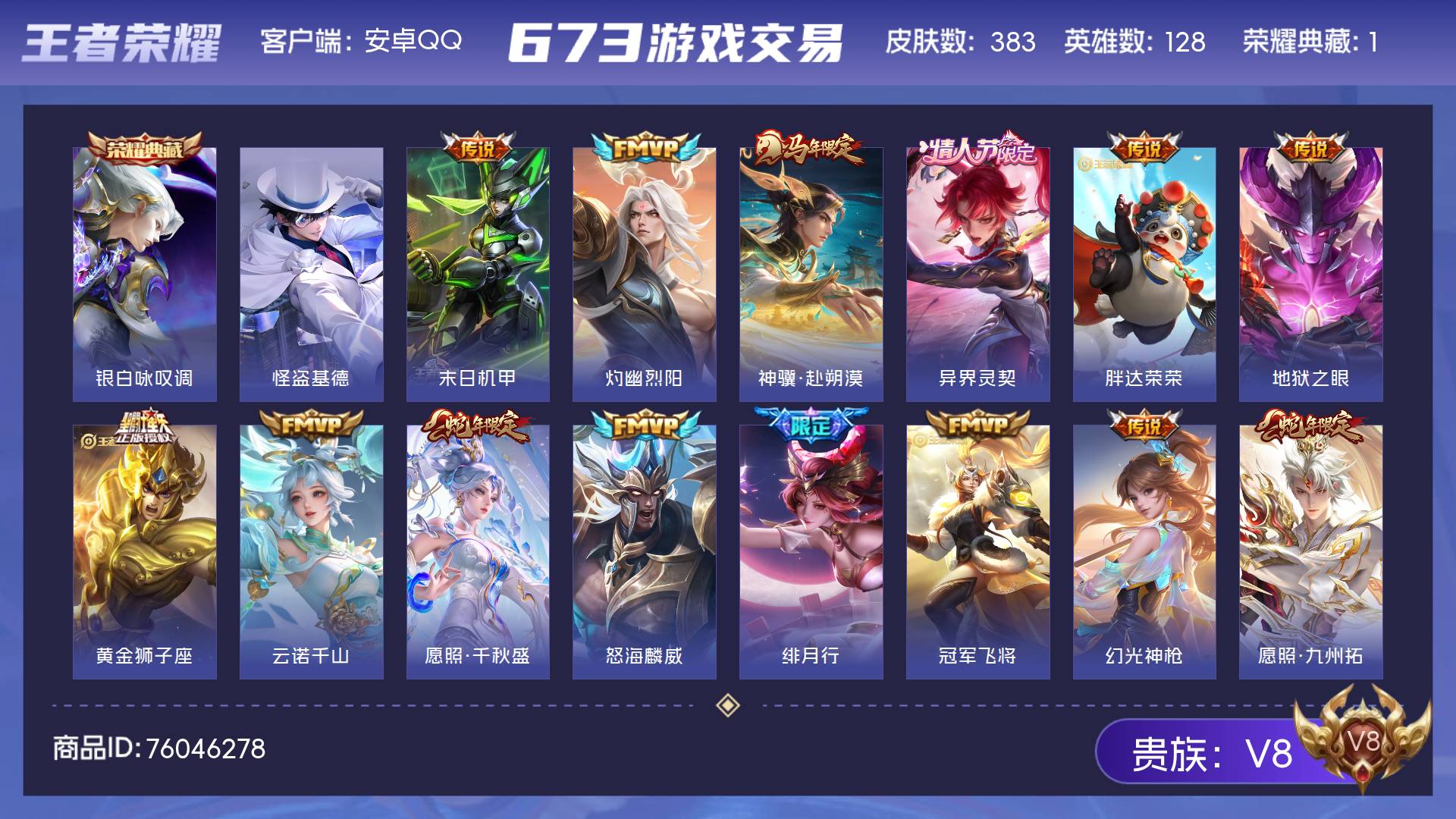 V8 皮肤383 英雄128 无双王者 荣耀典藏1 珍品传说1 星传说4 传说31 其他皮肤355