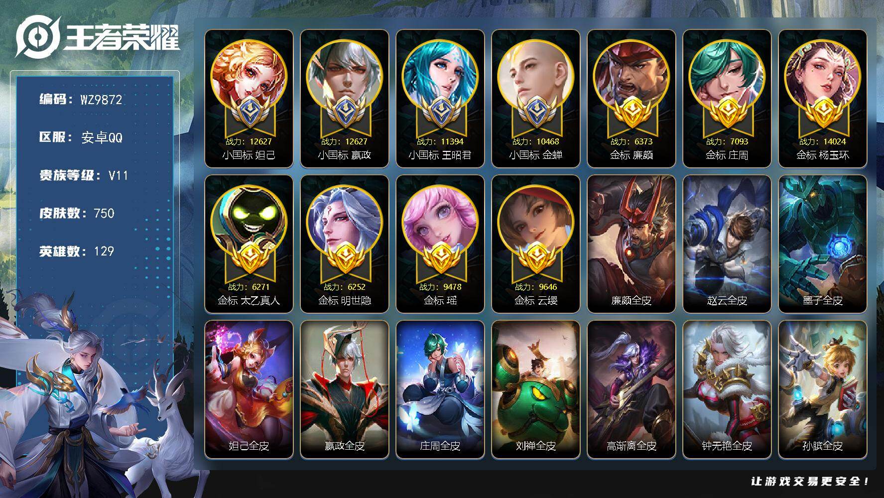 女号【四个小国标】V11-最强王者段位-129英雄-750皮肤-10典藏皮肤-