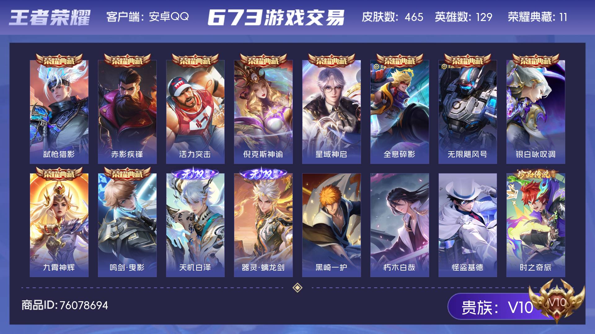 V10 皮肤465 英雄129 至尊星耀 荣耀典藏11 无双皮肤2 珍品传说5 传说62 其他皮肤392