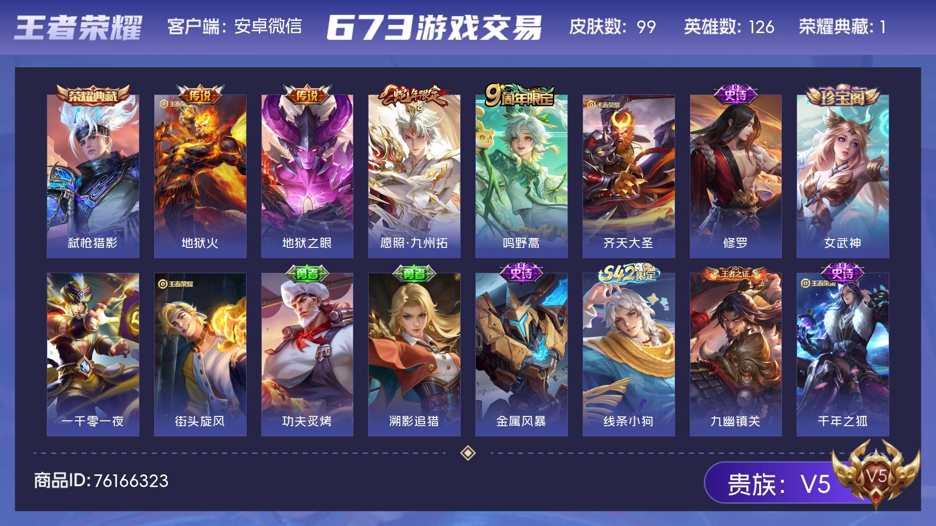 V5 皮肤99 英雄126 无双王者 荣耀典藏1 星传说1 传说5
