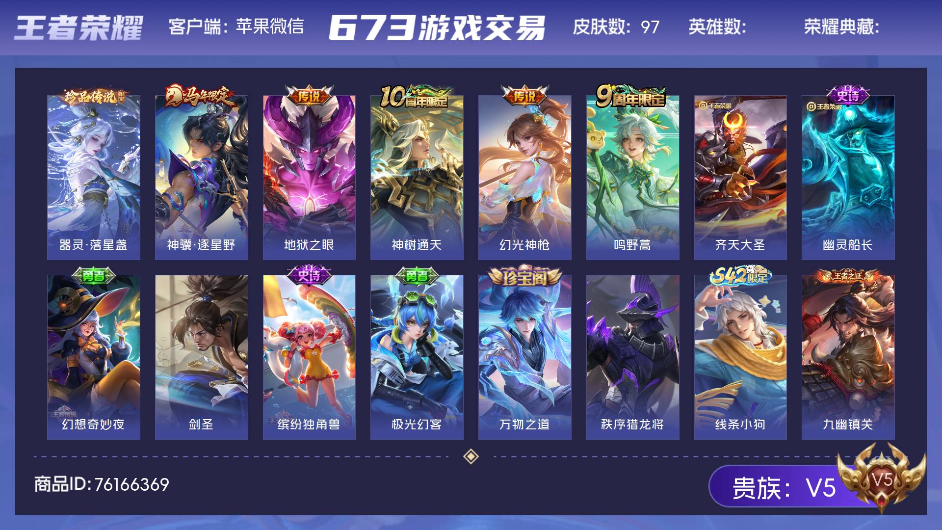 V5 皮肤97 荣耀王者 珍品传说1 星传说1 传说6