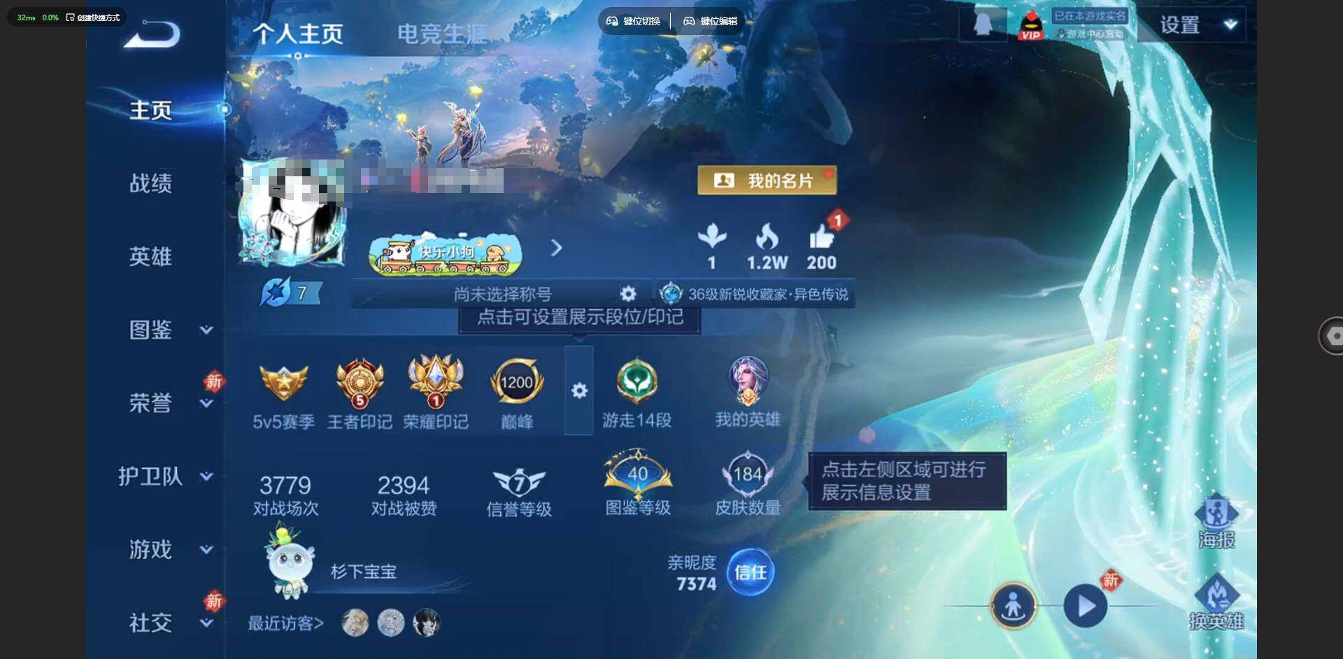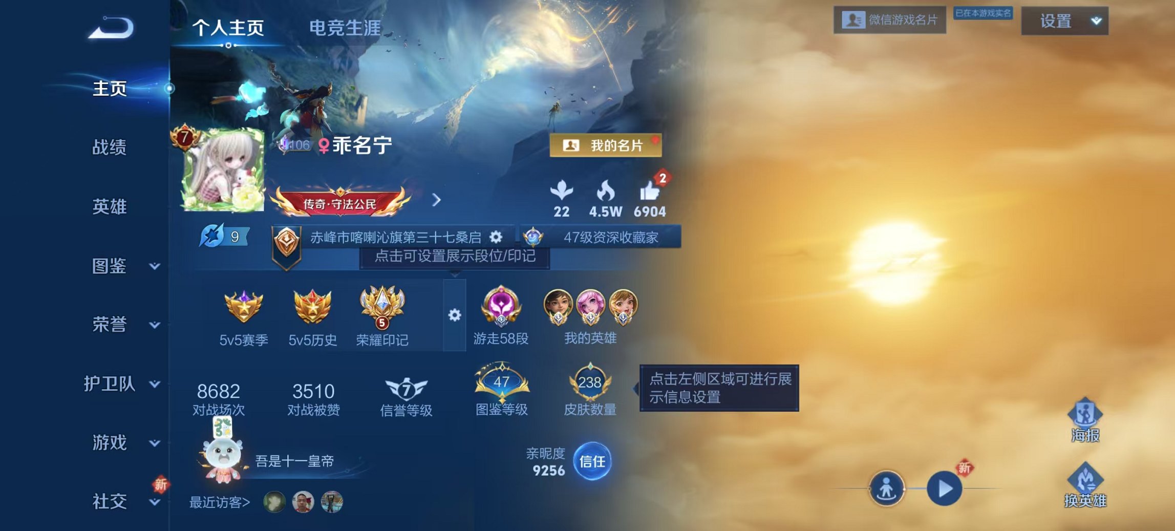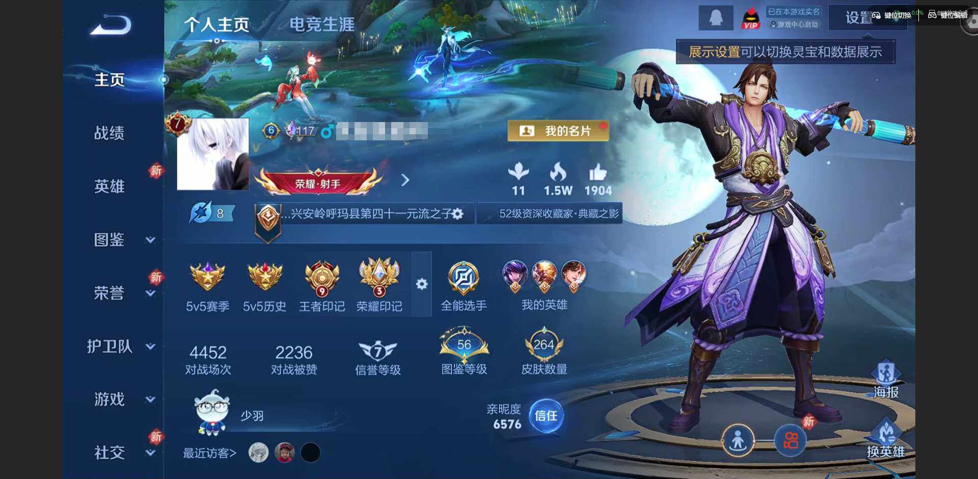 实名: 可修改 贵族等级: V7 英雄数: 128 皮肤数: 264 荣耀水晶