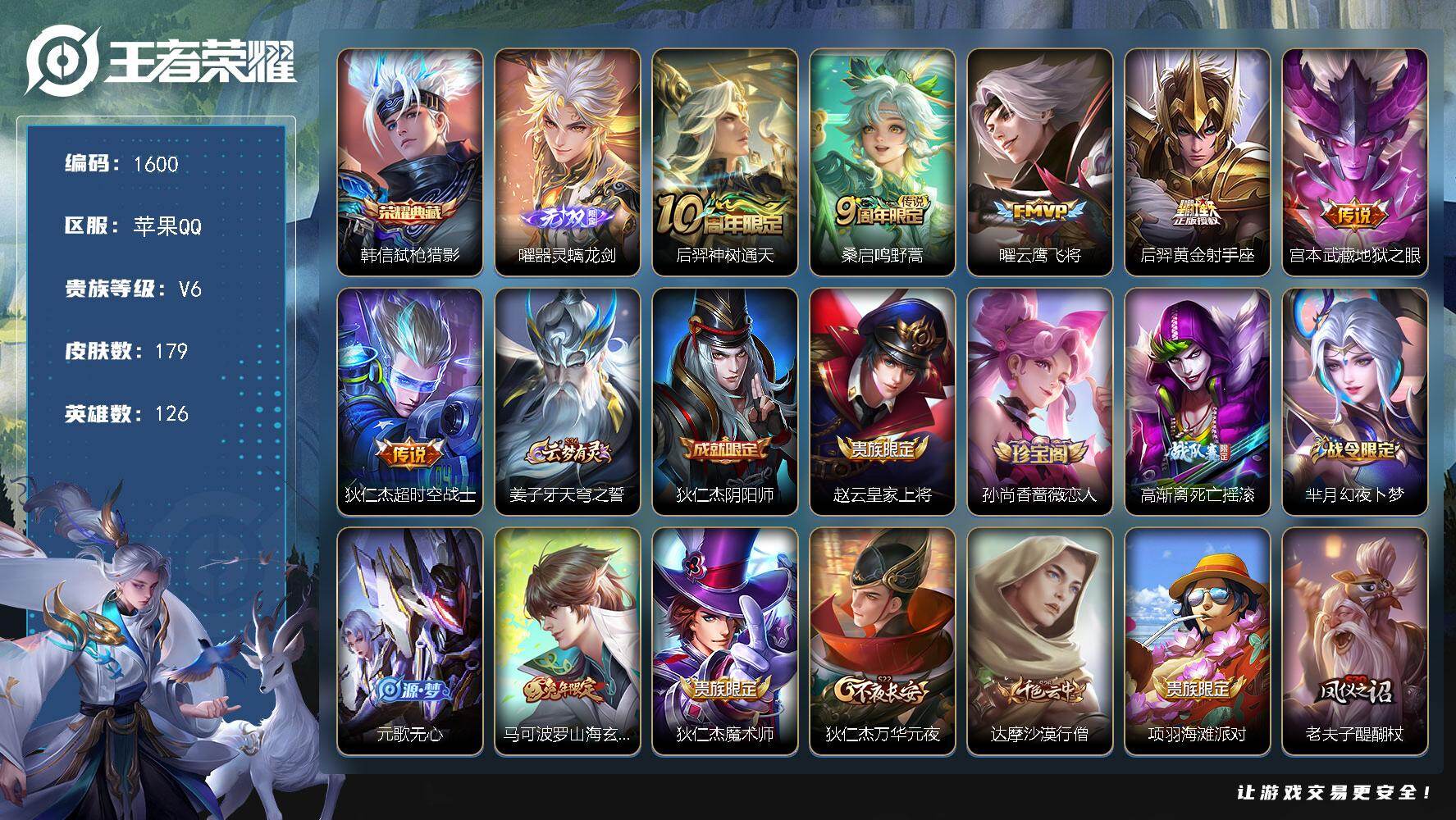 贵族等级: V6 英雄数: 127 皮肤数: 184 限定皮: 高山流水,五谷