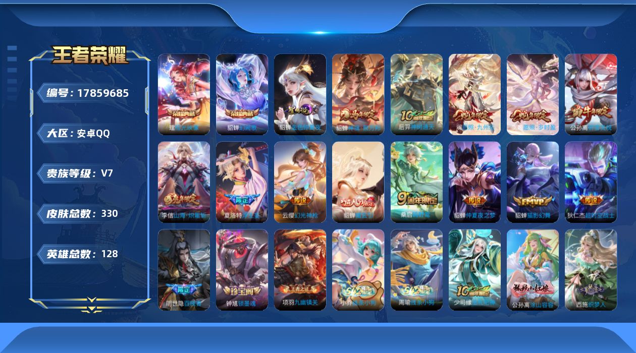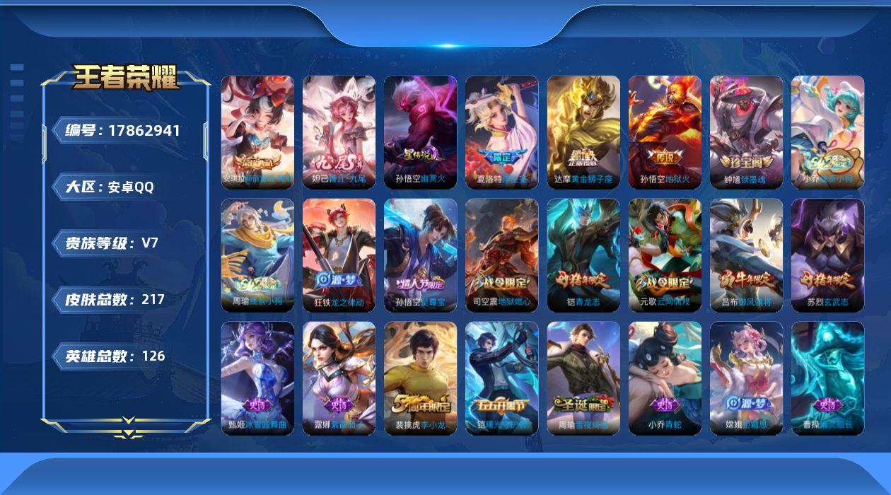 安卓QQ/至尊星耀/437皮肤/129英雄/1典藏/0珍品无双/1无双/2珍品传说/28传说/126