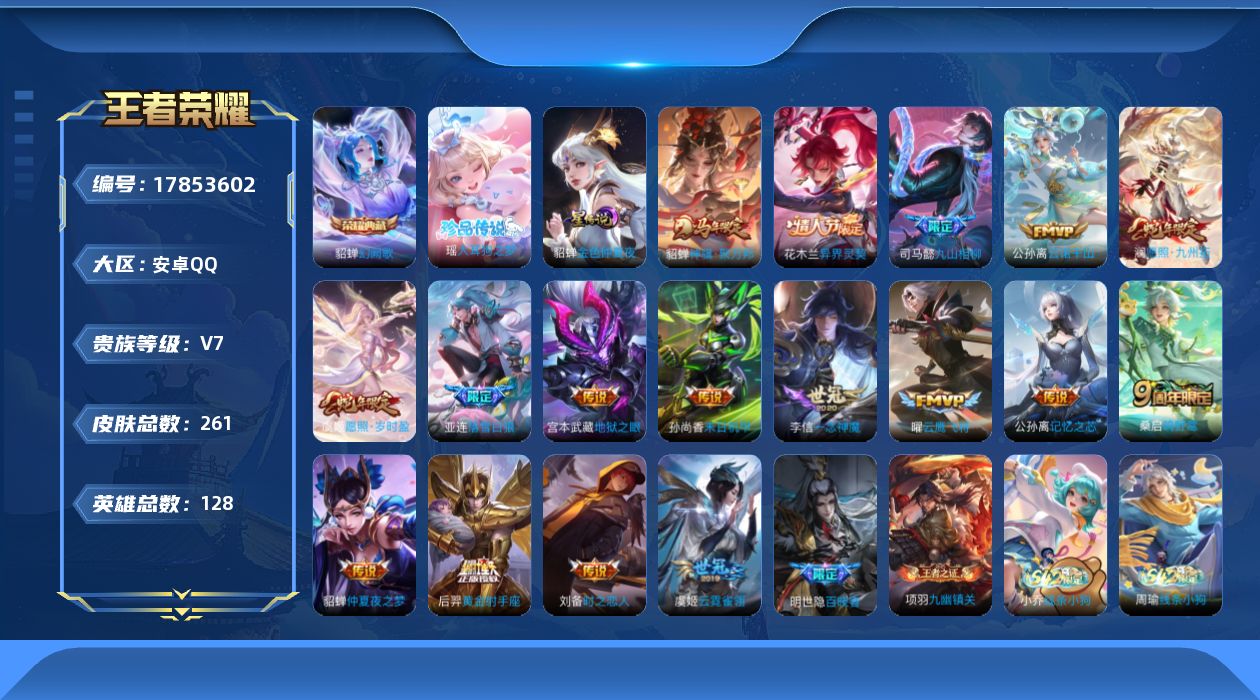 实名: 可修改 贵族等级: V7 英雄数: 127 皮肤数: 161 星传说: