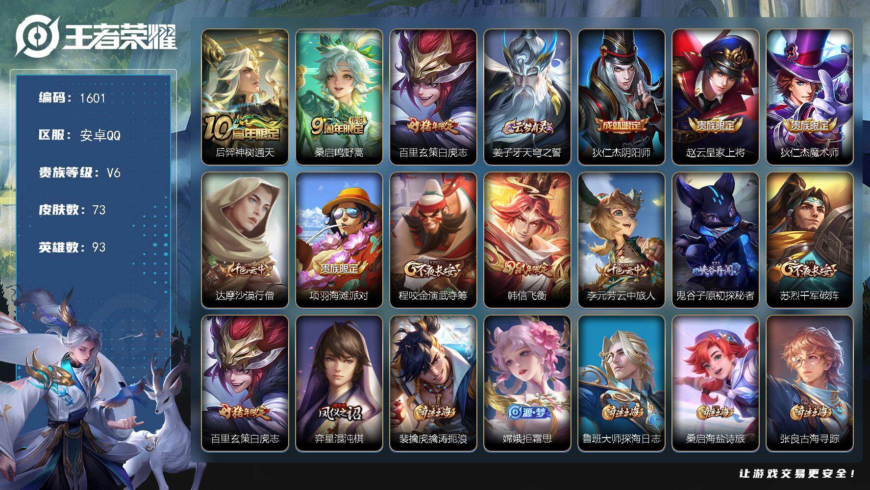 2618504 王者荣耀账号 安卓Q-V6-荣耀黄金III段位-93英雄-73