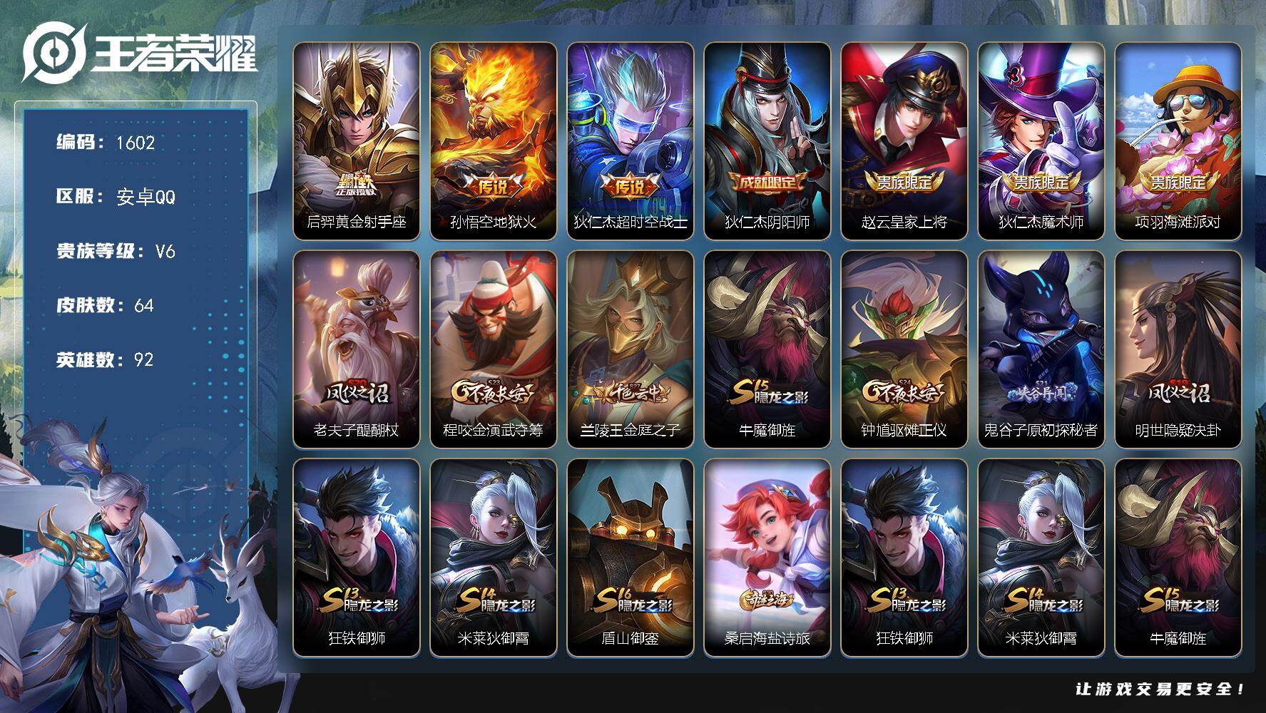 2618529 王者荣耀账号 安卓Q-V6-永恒钻石V段位-92英雄-64