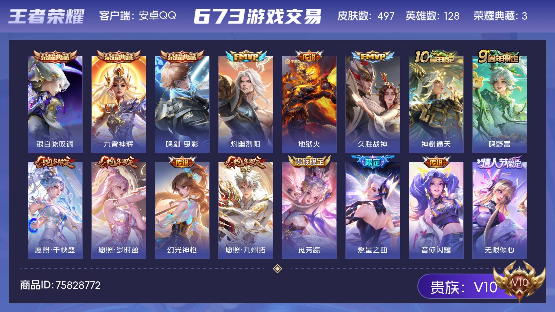 V10 皮肤497 英雄128 荣耀王者 荣耀典藏3 传说71 其他皮肤428