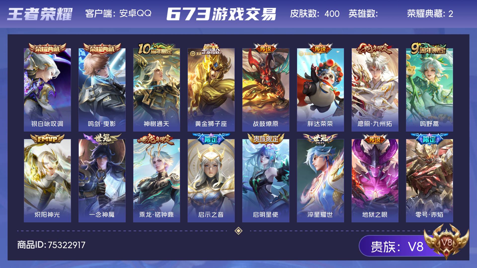 V8 皮肤400 至尊星耀 荣耀典藏2 星传说4 传说23 其他皮肤379