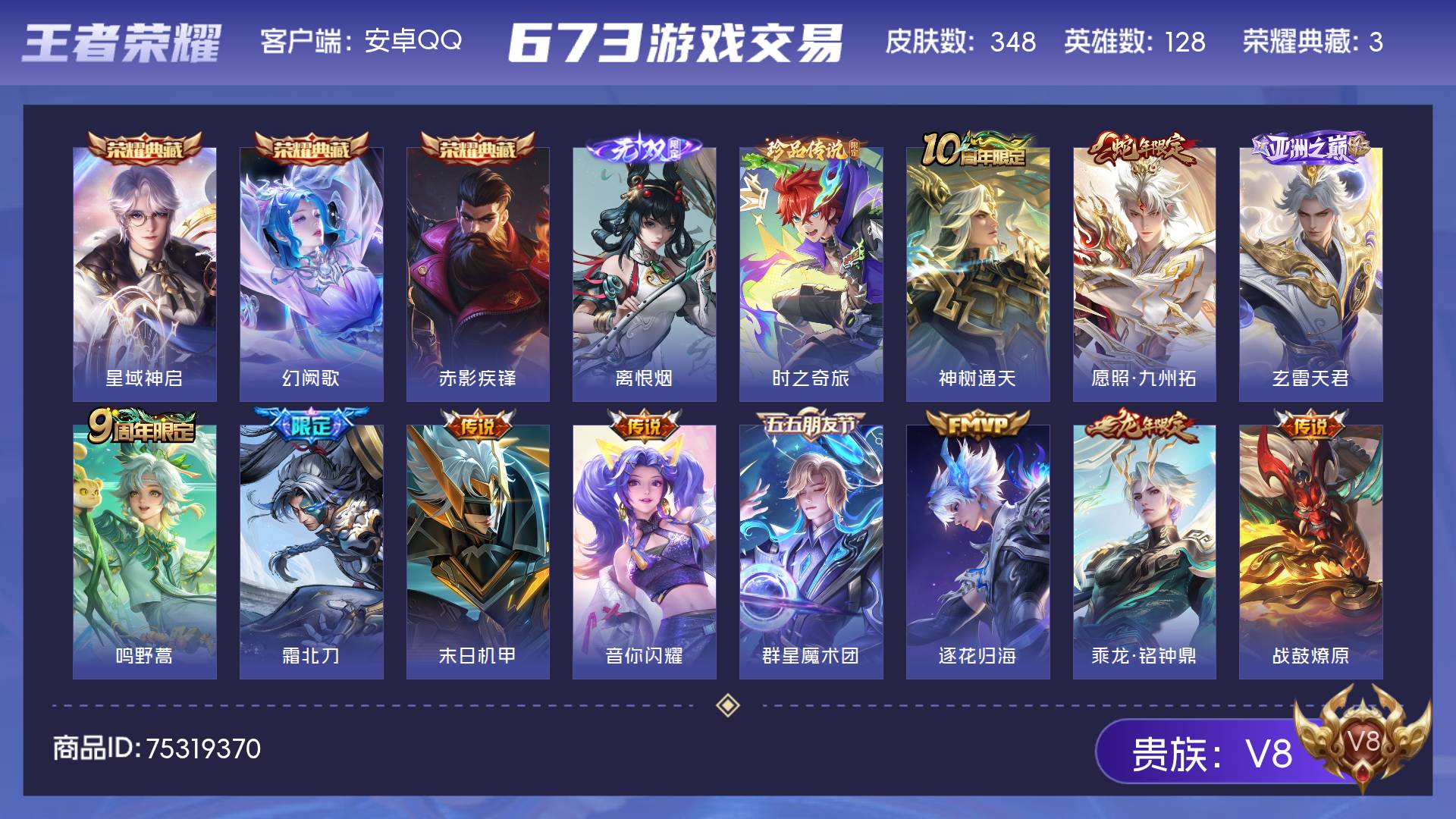 V8 皮肤348 英雄128 最强王者 荣耀典藏3 无双皮肤1 珍品传说1 传说22 其他皮肤327