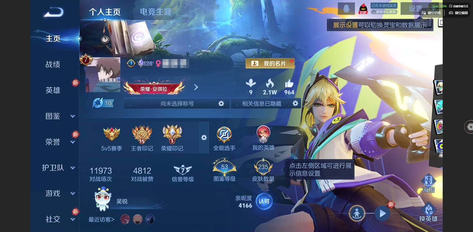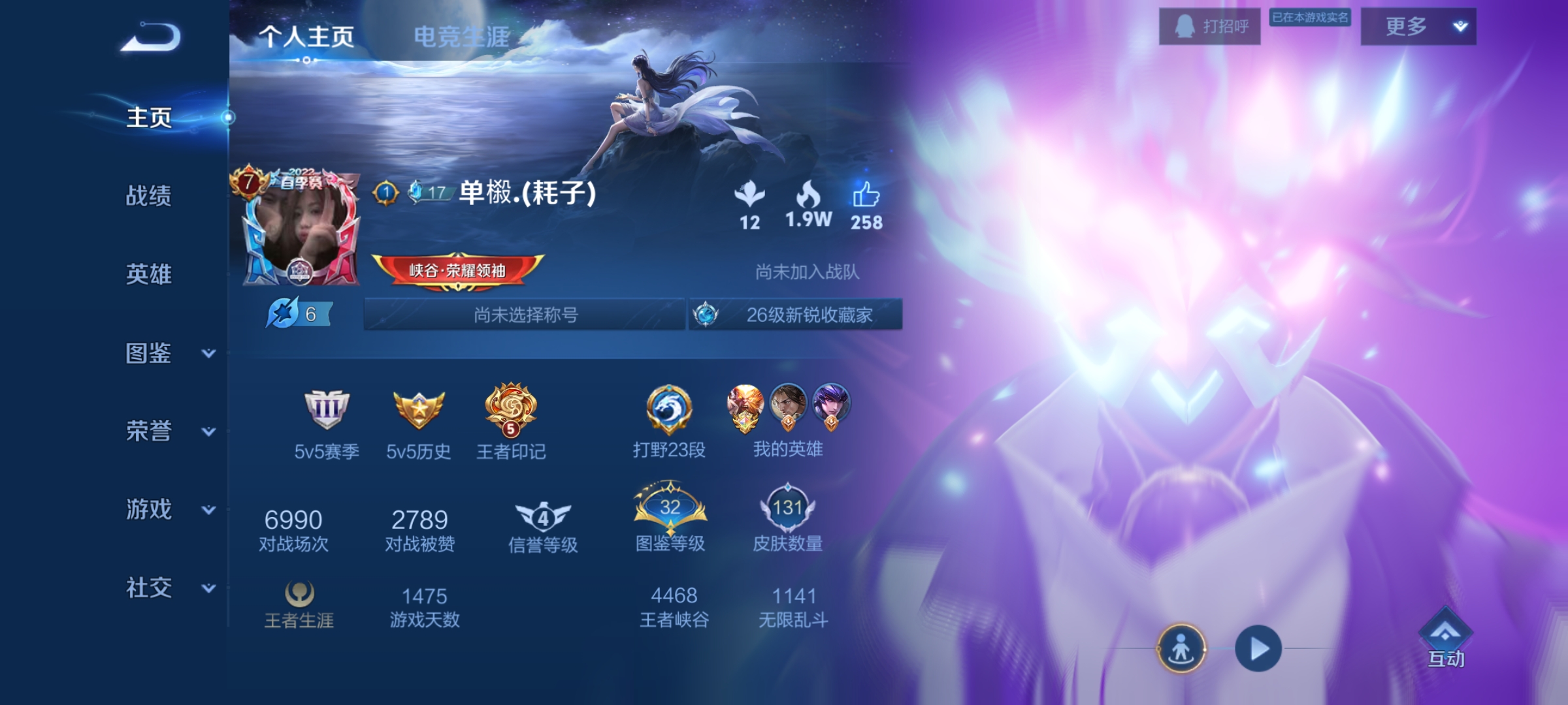 实名: 可修改 贵族等级: V7 英雄数: 128 皮肤数: 287 荣耀水晶